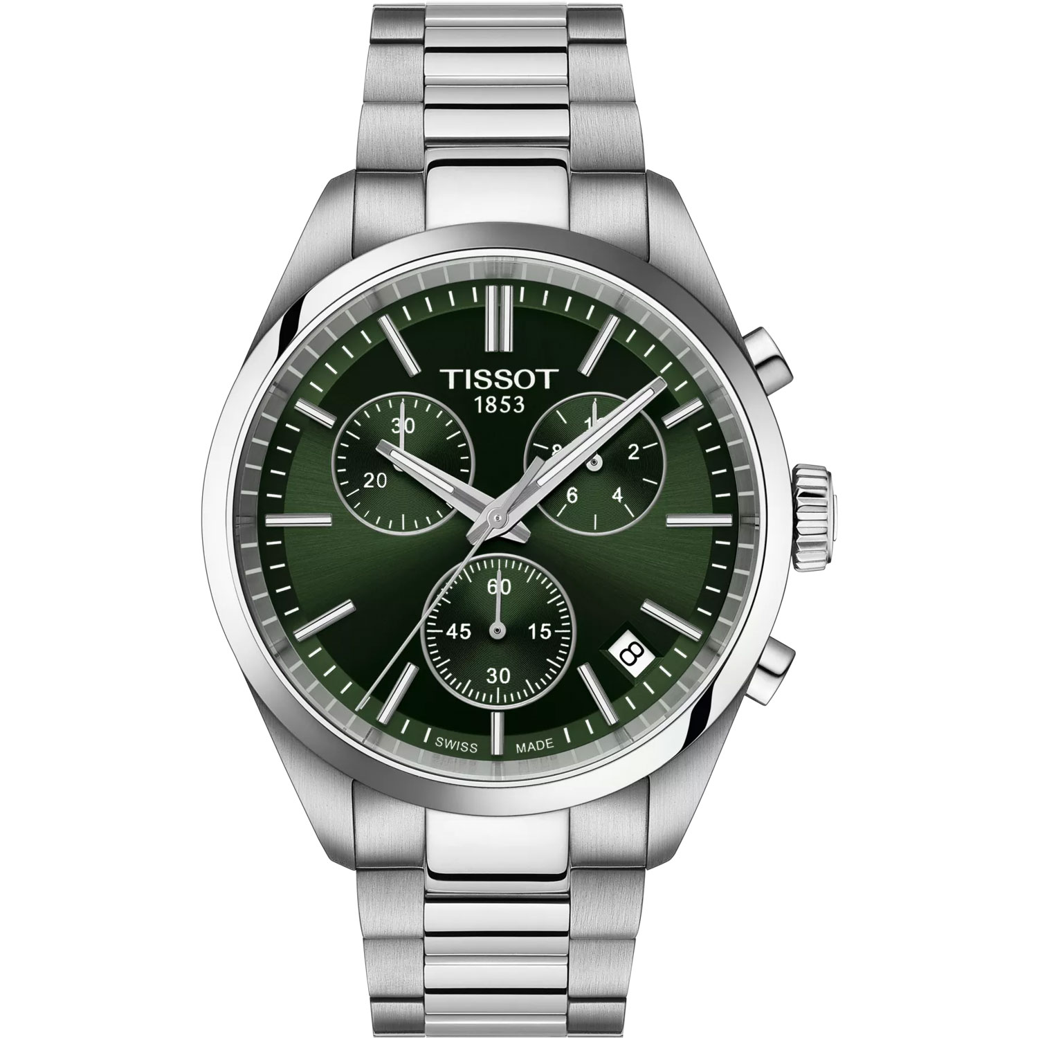Мужские кварцевые часы. Зеленый sunray циферблат, люминесцентные стрелки и штрихи, три субциферблата хронографа. Отображение даты. Круглый корпус из нержавеющей стали. Стальной браслет. Сапфировое стекло с антибликовым покрытием, защищающее от царапин. Водонепроницаемость WR 100 (плавание). Современный деловой стиль, швейцарская надежность и точность.