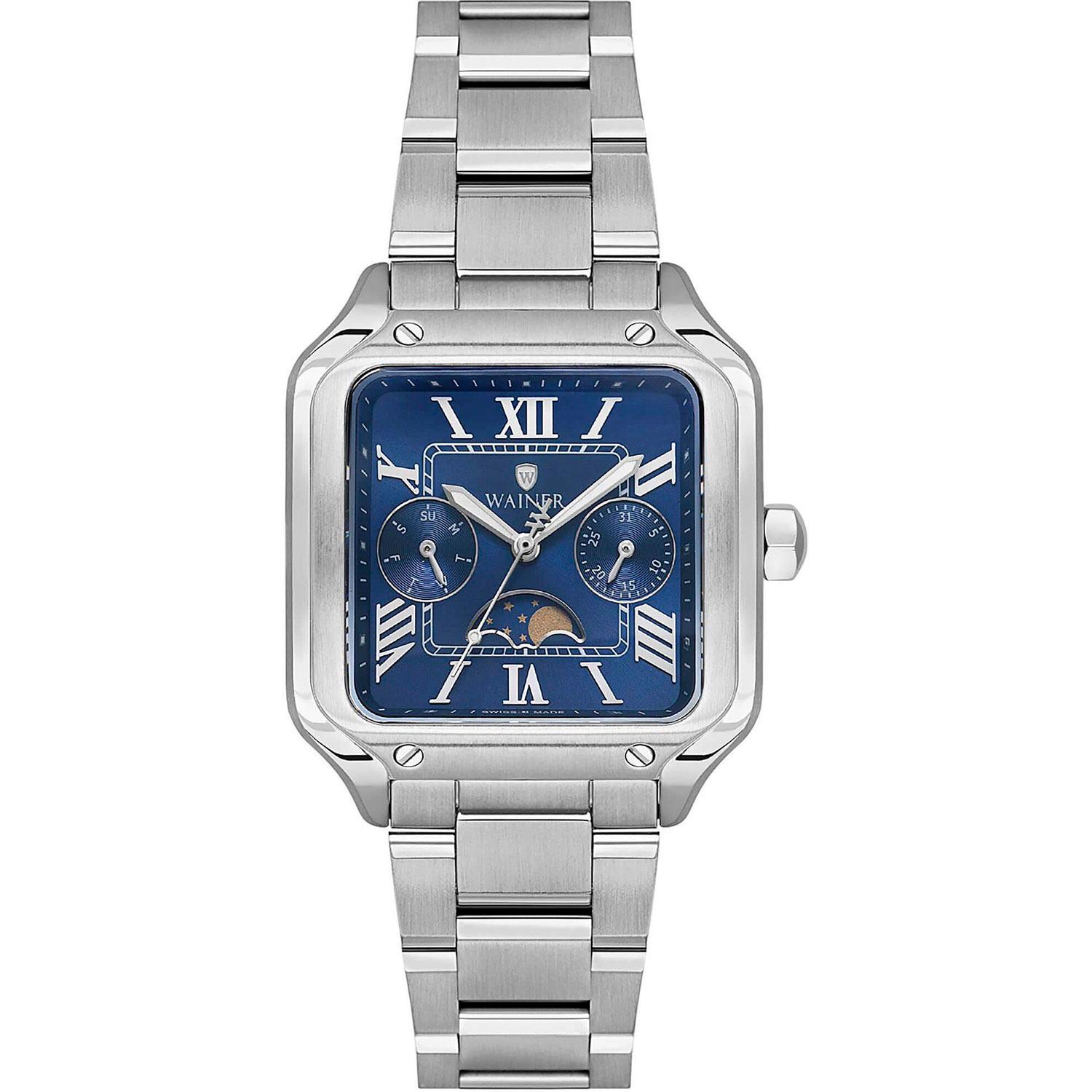 Женские кварцевые часы. Калибр механизма Ronda 706.1. Центральные часовая, минутная и секундная стрелки. Отображение даты и дня недели в малых циферблатах. Фазы Луны. Синий циферблат. Римская индикация времени. Квадратный корпус выполнен из нержавеющей стали. Размер корпуса составляет 32 х 32 мм, толщина 10 мм. Стальной браслет, раскладывающаяся застежка. Устойчивое к возникновению царапин сапфировое стекло. Водостойкость WR 30 (брызги).