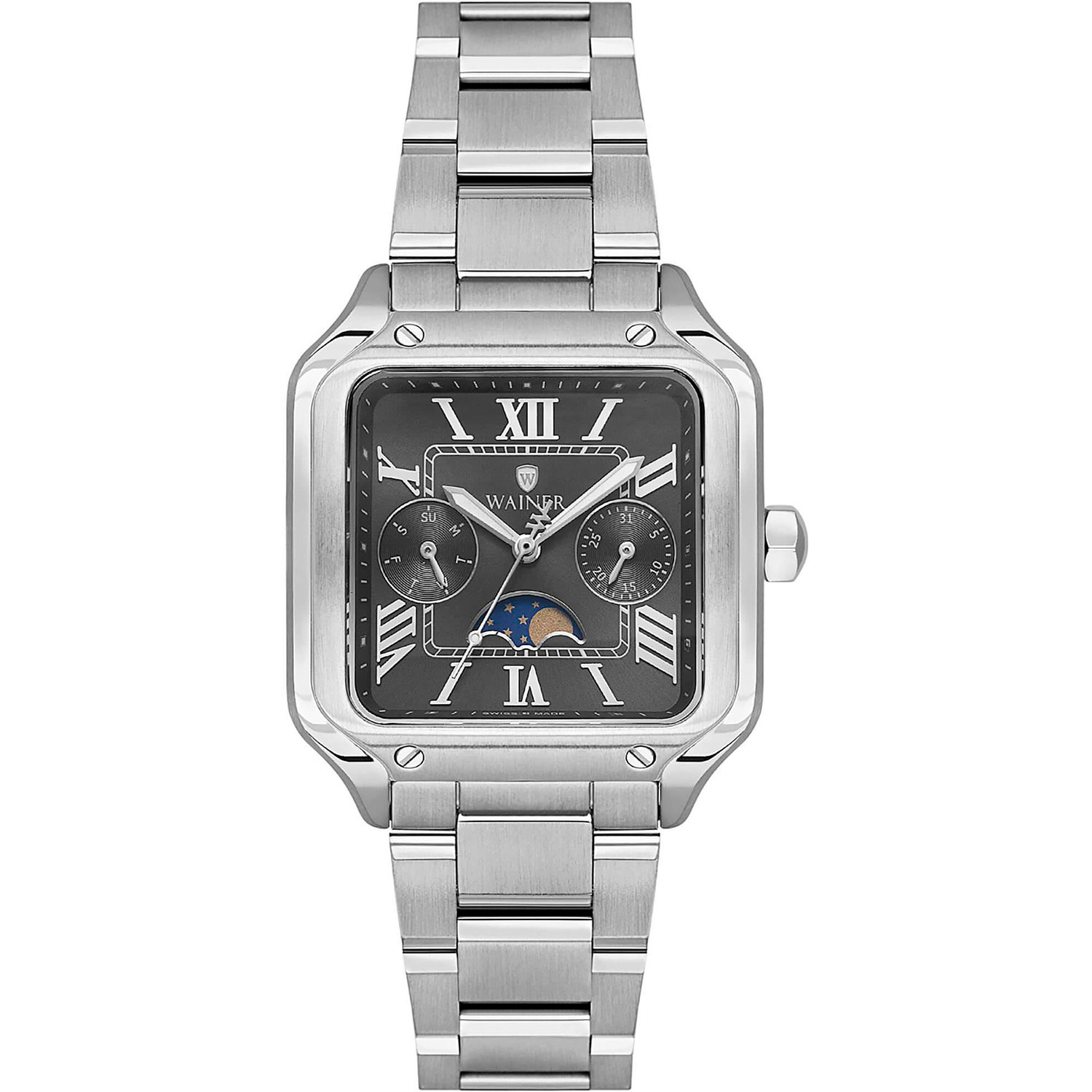 Женские кварцевые часы. Калибр механизма Ronda 706.1. Центральные часовая, минутная и секундная стрелки. Отображение даты и дня недели в малых циферблатах. Фазы Луны. Черный циферблат. Римская индикация времени. Квадратный корпус выполнен из нержавеющей стали. Размер корпуса составляет 32 х 32 мм, толщина 10 мм. Стальной браслет, раскладывающаяся застежка. Устойчивое к возникновению царапин сапфировое стекло. Водостойкость WR 30 (брызги).