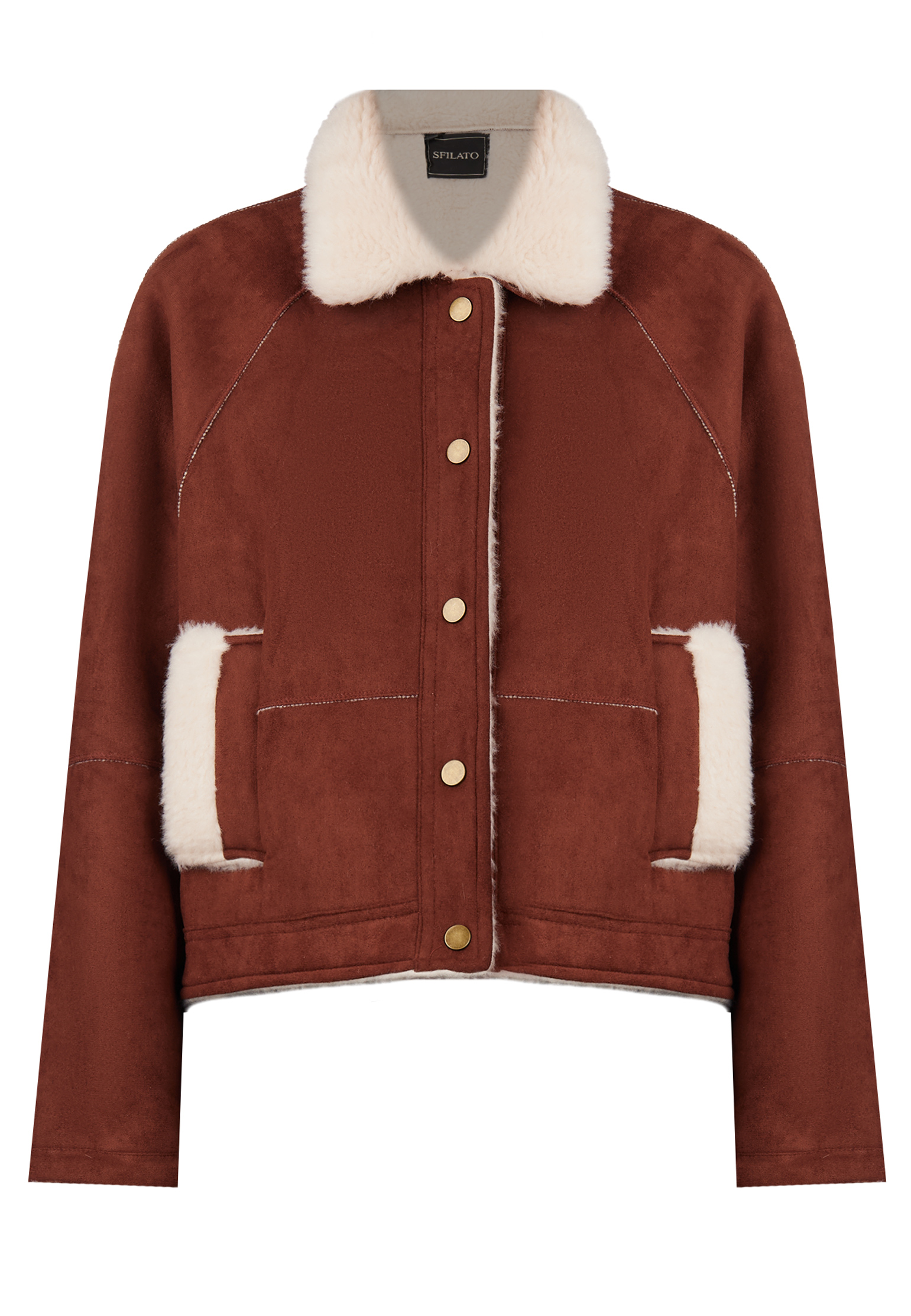 Модель укороченной длины с элегантным отложным воротником и двумя боковыми карманами предлагает удобство и стиль, в то время как рукава реглан обеспечивают свободу движения. Отделка из белого экомеха придаёт контраст и утончённость к общей эстетике. Застёжка на золотистые пуговицы добавляет нотку изысканности и блеска.