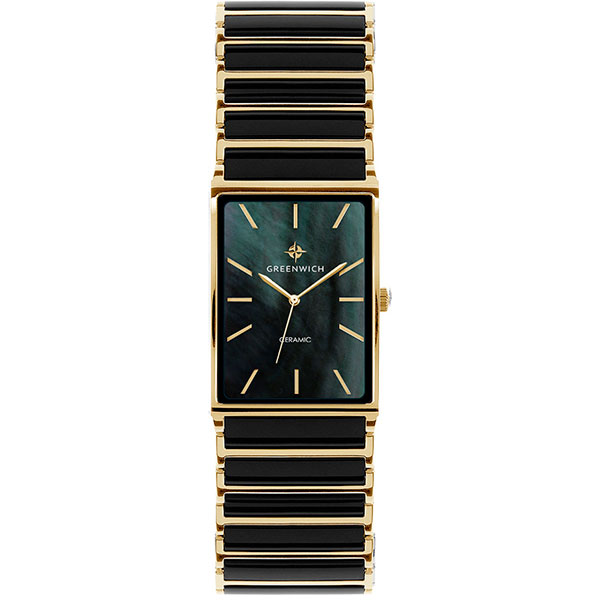 Женские кварцевые часы. Механизм TMI. Центральные часовая, минутная и секундная стрелки. Черный перламутровый циферблат. Прямоугольный корпус выполнен из нержавеющей стали c PVD покрытием цвета желтого золота. Размер корпуса составляет 20 х 28 мм. Стальной браслет с покрытием и керамическими вставками, раскладывающаяся застежка. Прочное минеральное стекло устойчивое к мелким механическим повреждениям. Водостойкость WR 50 (мытье рук, дождь).