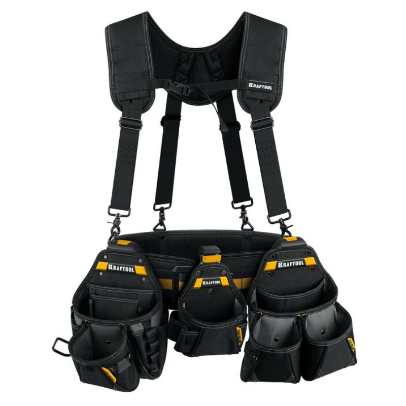 Пояс монтажника Kraftool KBS-5 38760-5, в комплекте: пояс монтажника, подтяжки и 3 сумки предназначены для переноски разнообразного инструмента, необходимого при проведении ремонтно-монтажных работ.Преимущества Система быстрого крепежа позволяет переставлять различные сумки Изготовлен из полиэстера 1680D обеспечивающего повышенной прочность на разрыв и стойкость к истиранию В комплект входят 3 сумки, широкий ремень и мягкие подтяжки Ремень регулируется от 80 до 122см Все сумки оснащены специальной подставкой, позволяющей размещать их на любой горизонтальной поверхности Металический держатель для молотка 2 металические скобы для рулетки 40 карманов и петель