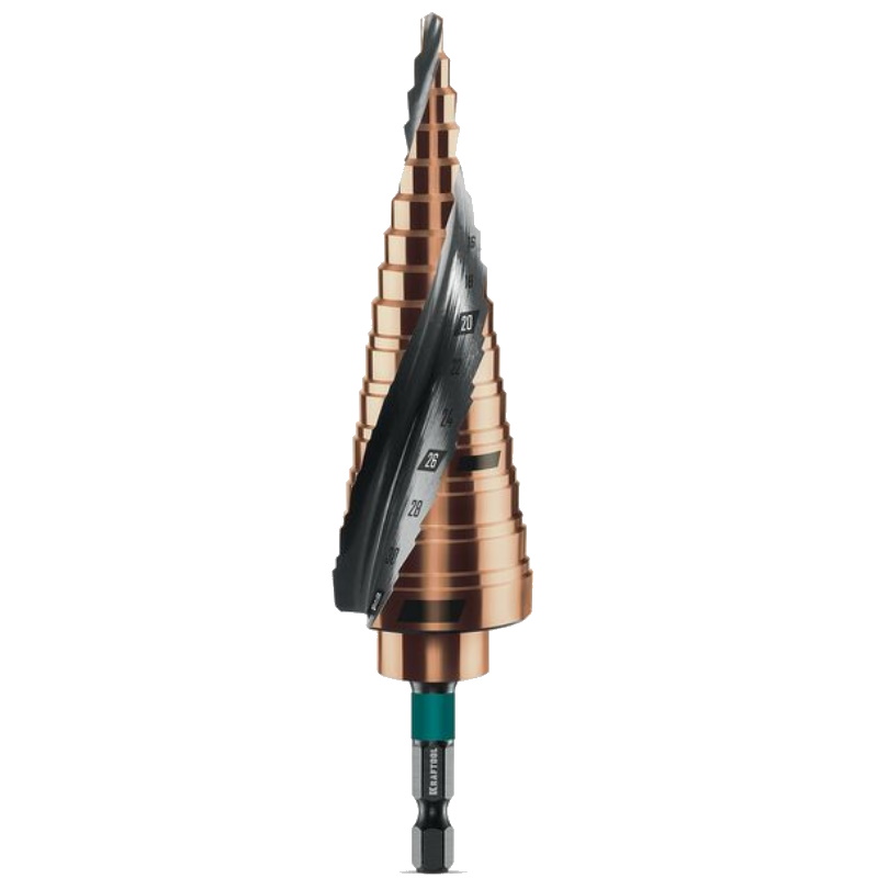 Сверло ступенчатое Kraftool COBALT 29691-4-32-15, 4-32 мм, 15 ступеней, азотирование, винтовая спираль - предназначено для сверления металлических конструкций и заготовок, листовых материалов, цветных металлов, пластика.Преимущества Сталь с добавлением кобальта значительно повышает рабочий ресурс Азотирование рабочик кромок существенно повышает срок службы U-образная спираль повышает точность и скорость реза Крестообразная подточка позволяет начать сверление без предварительного засверливания и кернения Угол заточки при вершине равный 135° для оптимального распределения усилий по режущей кромке Шестигранный хвостовик 1/4″ для использования в быстрозажимных патронах Максимальный уровень точности получаемых отверстий