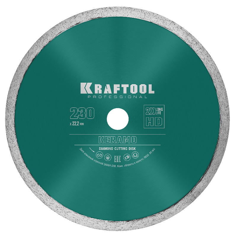 Алмазный диск Kraftool KERAMO 36684-230, 230 мм, 22.2 мм, 10 х 2.2 мм, сплошной