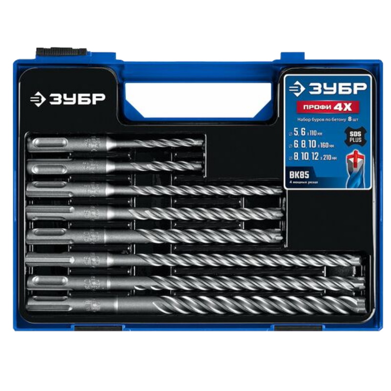 Буры Зубр ПРОФИ-4Х 29313-H8-1, SDS-plus, набор №1, 8 штук - предназначены для сверления отверстий в бетоне, граните, кирпичной кладке, камне и твердом известняке.Преимущества Геометрическая форма наконечника с 4 кромками предотвращает заедание и поломку, обеспечивая эффективное сверление даже железобетона Повышенный ресурс благодаря цельному усиленному наконечнику из твердого сплава ВК85 4-канальная конструкция спирали хорошо удаляет пыль и служит для быстрого сверления с пониженным износом