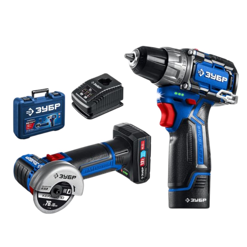 Набор Зубр Профессионал КОМПАКТ №5 DB-121-42AB: Дрель-шуруповерт + мини УШМ, BRUSHLESS, 12 В, 45 Н·м, 2 АКБ тип Т7 (4 и 2 А·ч), кейс