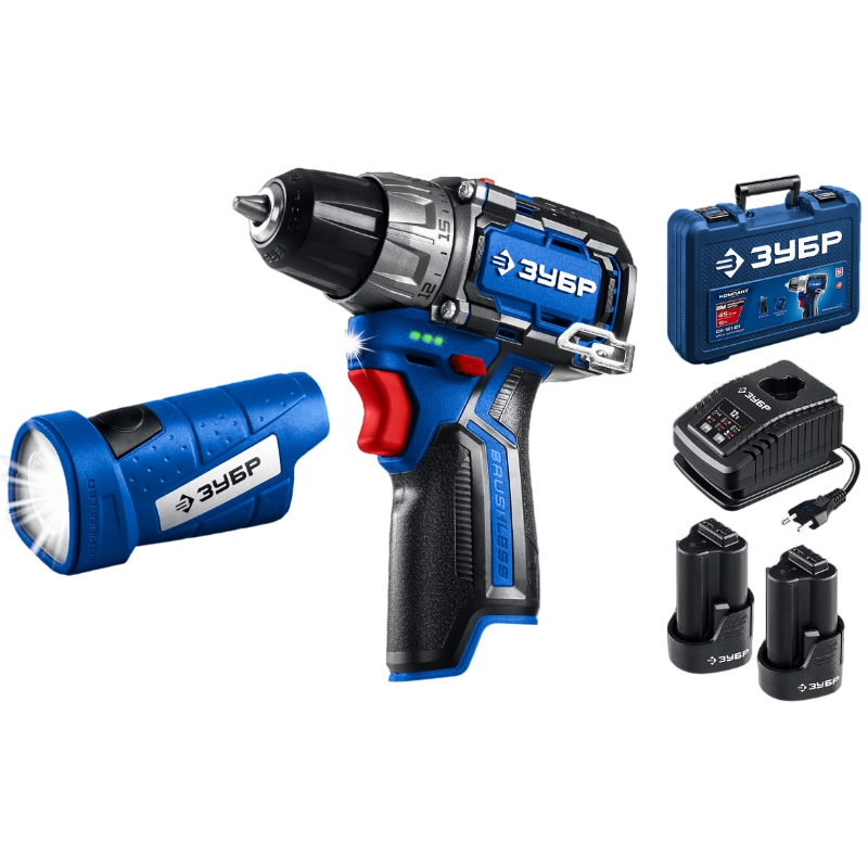 Дрель-шуруповерт + LED фонарь Зубр DB-121-22F, КОМПАКТ №4, BRUSHLESS, 12 В, 45 Н·м, 2 АКБ тип Т7 (2 А·ч), кейс, Профессионал