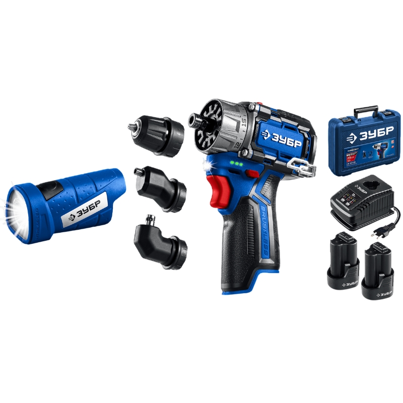 Набор: модульная Дрель-шуруповерт + LED фонарь Зубр DB-125-22F, КОМБИ №4, BRUSHLESS, 12 В, 45 Н·м, 2 АКБ тип Т7 (2 А·ч), кейс, Профессионал