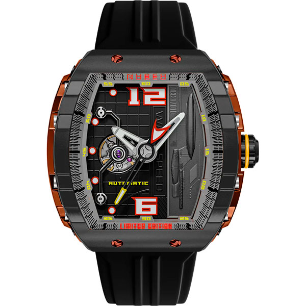 Мужские механические часы с автоподзаводом. Центральные часовая, минутная и секундная стрелки. Черно-серый циферблат украшен захватывающим 3D-изображением сбоку культового космического корабля NCC-1701D. Стрелки и часовые метки с покрытием Swiss Newlite. Корпус формы тонно выполнен из нержавеющей стали 316L с частичным серым и оранжевым IP покрытием. Размер корпуса составляет 48 х 51 х 17 мм. Заводная головка с защитой. Черный каучуковый ремешок шириной 26 мм, стандартная застежка. Прочное минеральное стекло устойчивое к мелким механическим повреждениям. Водостойкость WR 50 (мытье рук, дождь). Вес 125 г. Лимитированная серия. Коллаборация с культовой франшизой «Звёздный путь».