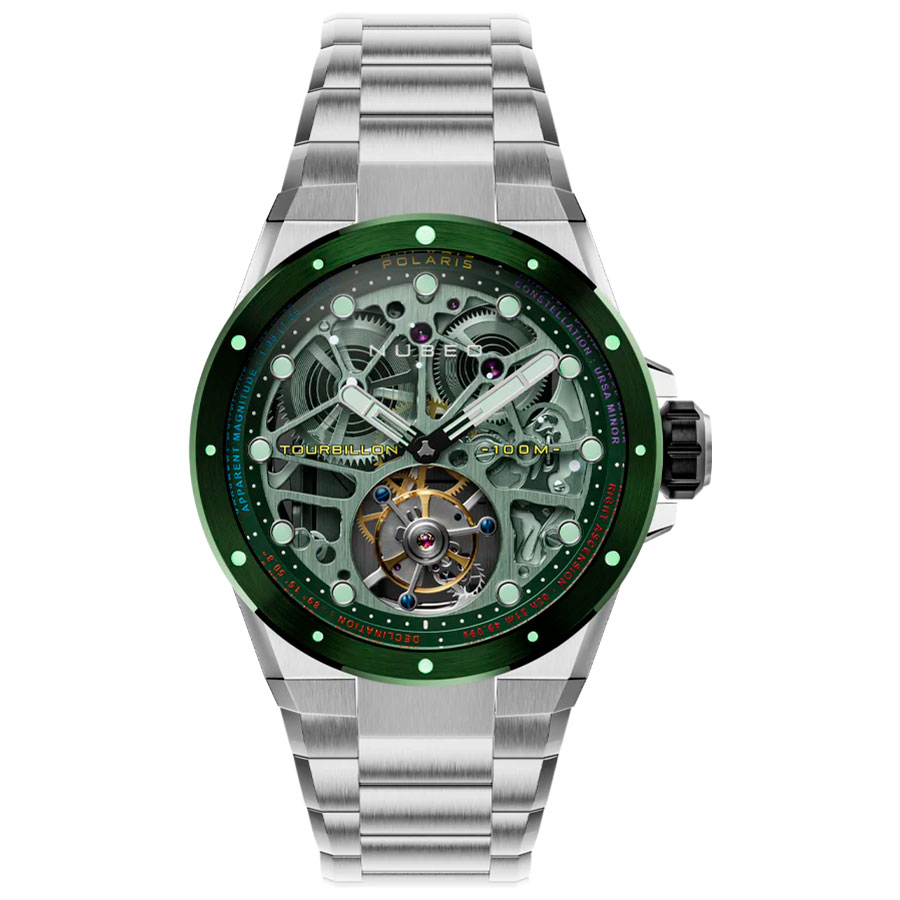 Мужские механические часы с ручным заводом. Центральные часовая и минутная стрелки. Турбийон. Зеленый скелетонизированный циферблат. Стрелки и часовые метки с покрытием Swiss Super-LumiNova. Круглый корпус выполнен из нержавеющей стали. Размер корпуса составляет 46 х 54 х 15,4 мм. Заводная головка с защитой. Стальной браслет шириной 29 мм, раскладывающаяся застежка с предохранительной защелкой. Устойчивое к возникновению царапин сапфировое стекло. Водостойкость WR 100 (плавание без погружения). Вес 250 г. Лимитированная серия - 30 экземпляров.