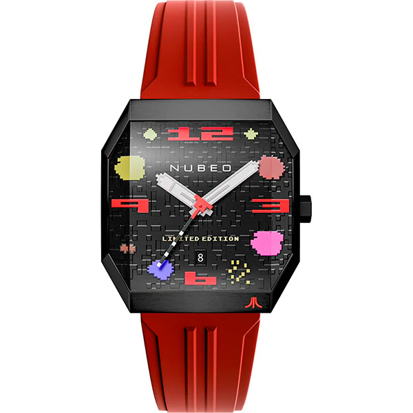 CONSOLE AUTOMATIC ATARI ASTEROIDS - часы, вдохновленные одной из самых культовых аркадных игр, вдохновлены винтажной консолью ATARI 2600 и классической игрой Asteroids. Мужские механические часы с автоподзаводом. Центральные часовая, минутная и секундная стрелки. Секундная стрелка в форме космического корабля отдаёт дань уважения пикселизированному движку Asteroids. Апертура даты в позиции 6 часов. Черный циферблат. Стрелки и часовые метки с покрытием Swiss Newlite. Восьмиугольный стальной корпус с черным IP покрытием выполнен по образцу консоли ATARI. Размер корпуса составляет 42 х 45 х 15 мм. Красный каучуковый ремешок шириной 26 мм, стандартная застежка. Многогранное минеральное стекло устойчивое к мелким механическим повреждениям с антибликовым покрытием. Водостойкость WR 50 (мытье рук, дождь). Вес 95 г. Лимитированная серия - 100 экземпляров.