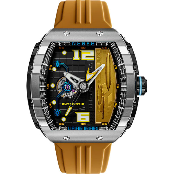 Мужские механические часы с автоподзаводом. Центральные часовая, минутная и секундная стрелки. Черно-золотистый циферблат украшен захватывающим 3D-изображением сбоку культового космического корабля NCC-1701D. Стрелки и часовые метки с покрытием Swiss Newlite. Корпус формы тонно выполнен из нержавеющей стали 316L с частичным черным IP покрытием. Размер корпуса составляет 48 х 51 х 17 мм. Заводная головка с защитой. Бежевый каучуковый ремешок шириной 26 мм, стандартная застежка. Прочное минеральное стекло устойчивое к мелким механическим повреждениям. Водостойкость WR 50 (мытье рук, дождь). Вес 125 г. Лимитированная серия. Коллаборация с культовой франшизой «Звёздный путь».