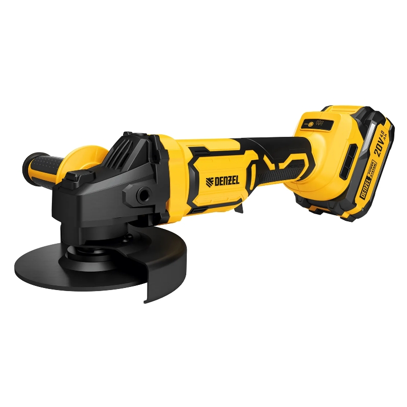 Аккумуляторная шлифовальная угловая машина Denzel с бесщеточным двигателем работает от источника питания Li-Ion 20 В. Позволяет шлифовать, резать и зачищать различные поверхности с использованием соответствующей оснастки диаметром 125 мм. Надежный бесщеточный двигатель обеспечивает стабильно высокую производительность в течение всего срока эксплуатации. Инструмент оптимален для бытового использованияПреимущества Три режима работы — можно установить частоту вращения оснастки 3400, 6500 или 9000 об/мин в зависимости от обрабатываемой поверхности и используемой оснастки Удобная работа — блокировка шпинделя облегчает установку и замену оснастки Эргономичность — боковую рукоятку можно установить слева, справа или сверху для наиболее удобного захвата и максимального контроля над инструментом Универсальность — аккумулятор Li-Ion емкостью 4 А·ч совместим со всеми инструментами единой платформы Denzel Power System 20V Контроль уровня заряда — индикатор на корпусе батареи позволяет быстро определить, когда необходима подзарядка Готовность к использованию — УШМ поставляется с аккумулятором, зарядным устройством, боковой рукояткой и специальным ключом для фиксации оснастки Безопасная работа — токопроводящие элементы надежно изолированы, специальный кожух защищает пользователя от летящих твердых частиц, а также от случайного контакта с вращающейся оснасткой Защита от случайного включения — производитель предусмотрел блокировку, предотвращающую непредвиденный запуск двигателя и травмирование пользователя Удобное управление — установка нужной частоты вращения производится нажатием на кнопку, специальный индикатор отображает выбранное значение Плавный пуск — при включении отсутствует рывок инструмента Продуманная конструкция — ключ для фиксации оснастки можно хранить в специальном отсеке в боковой рукоятке