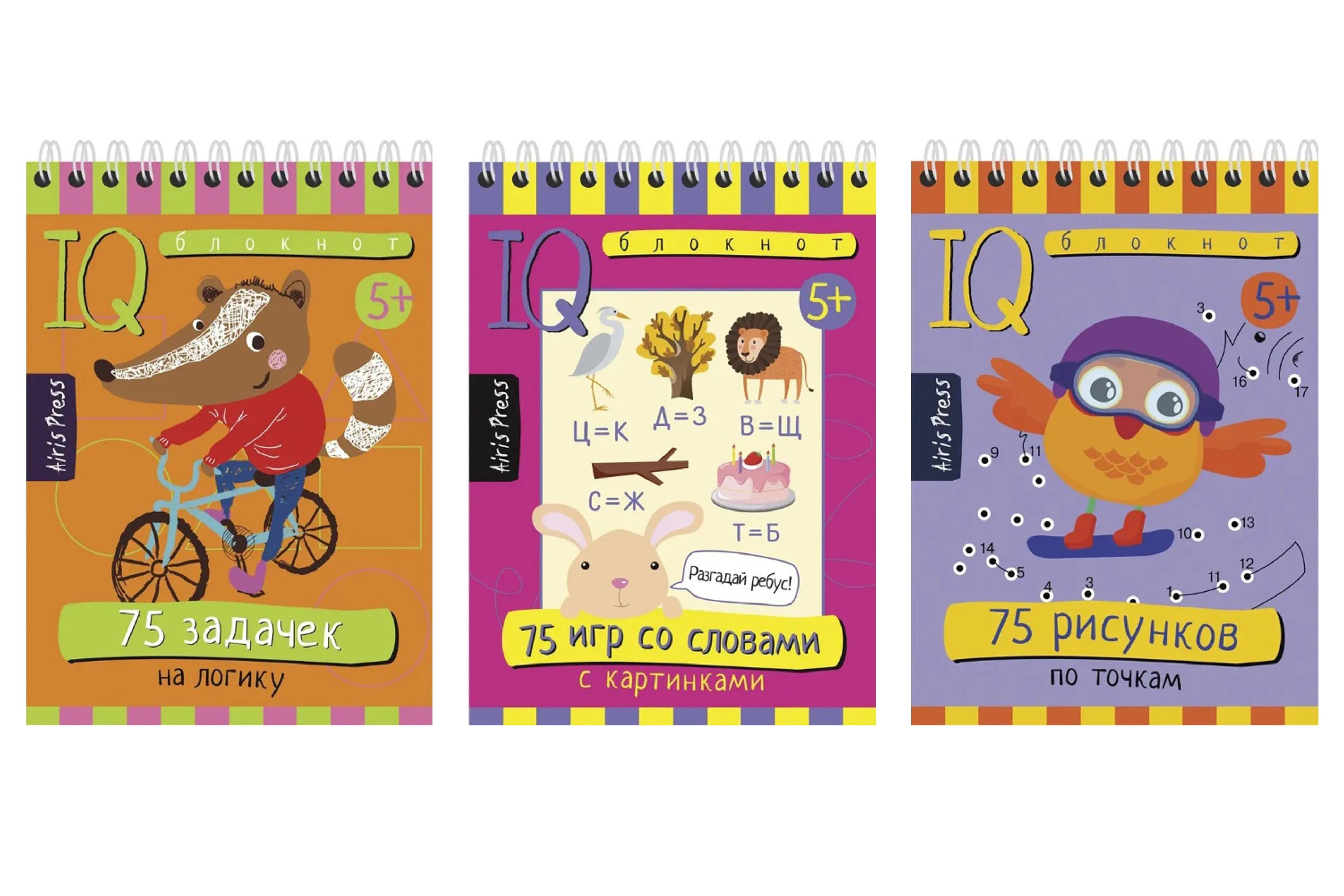 Комплект из 3 блокнотов: IQ блокноты детские. Игры для детей в дорогу 5+: 75 задачек + 75 рисунков + 75 игр со словами; Айрис-пресс
