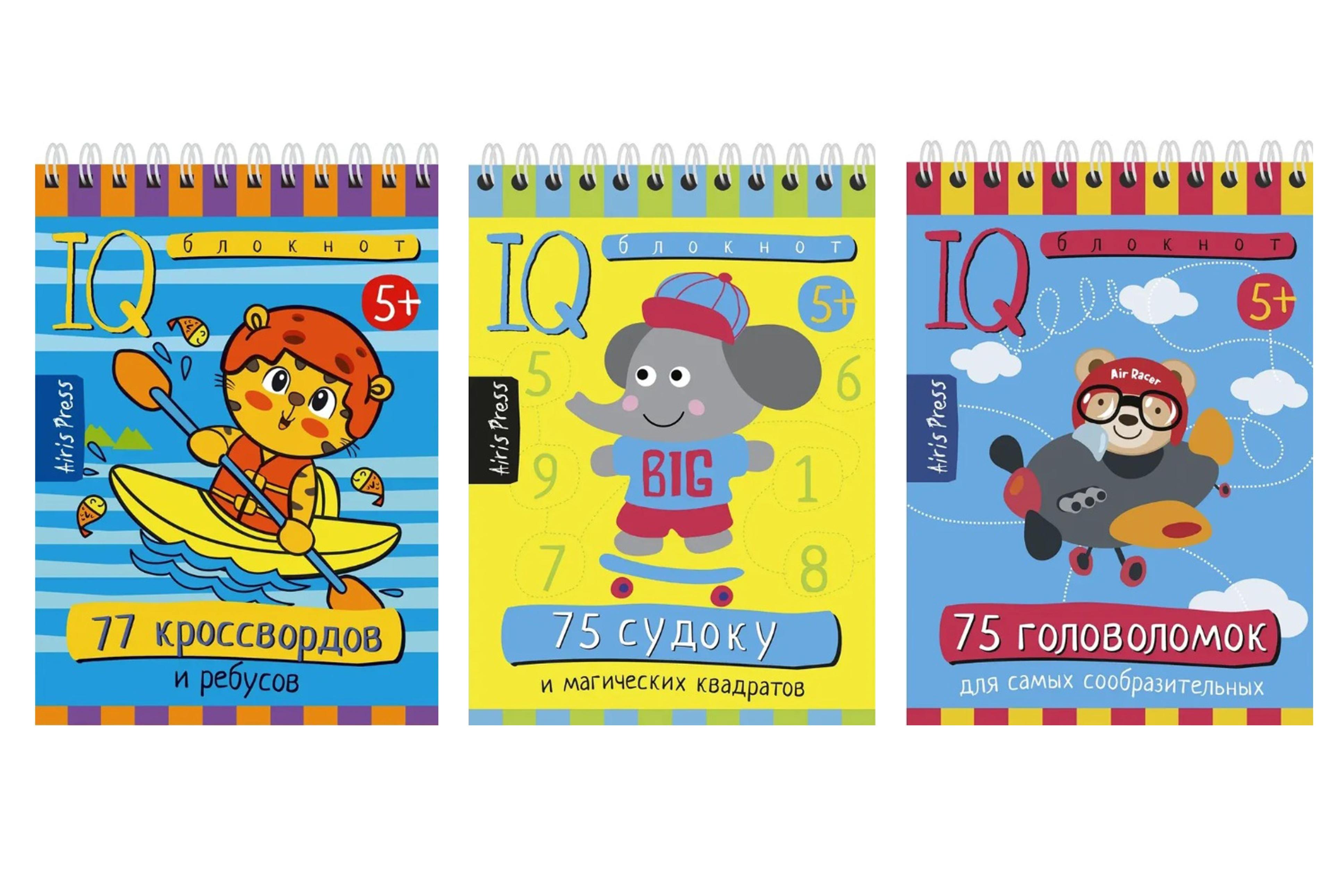 Комплект из 3 блокнотов: IQ блокноты детские. Игры для детей в дорогу 5+: 75 судоку + 75 головоломок + 77 кроссвордов; Айрис-пресс