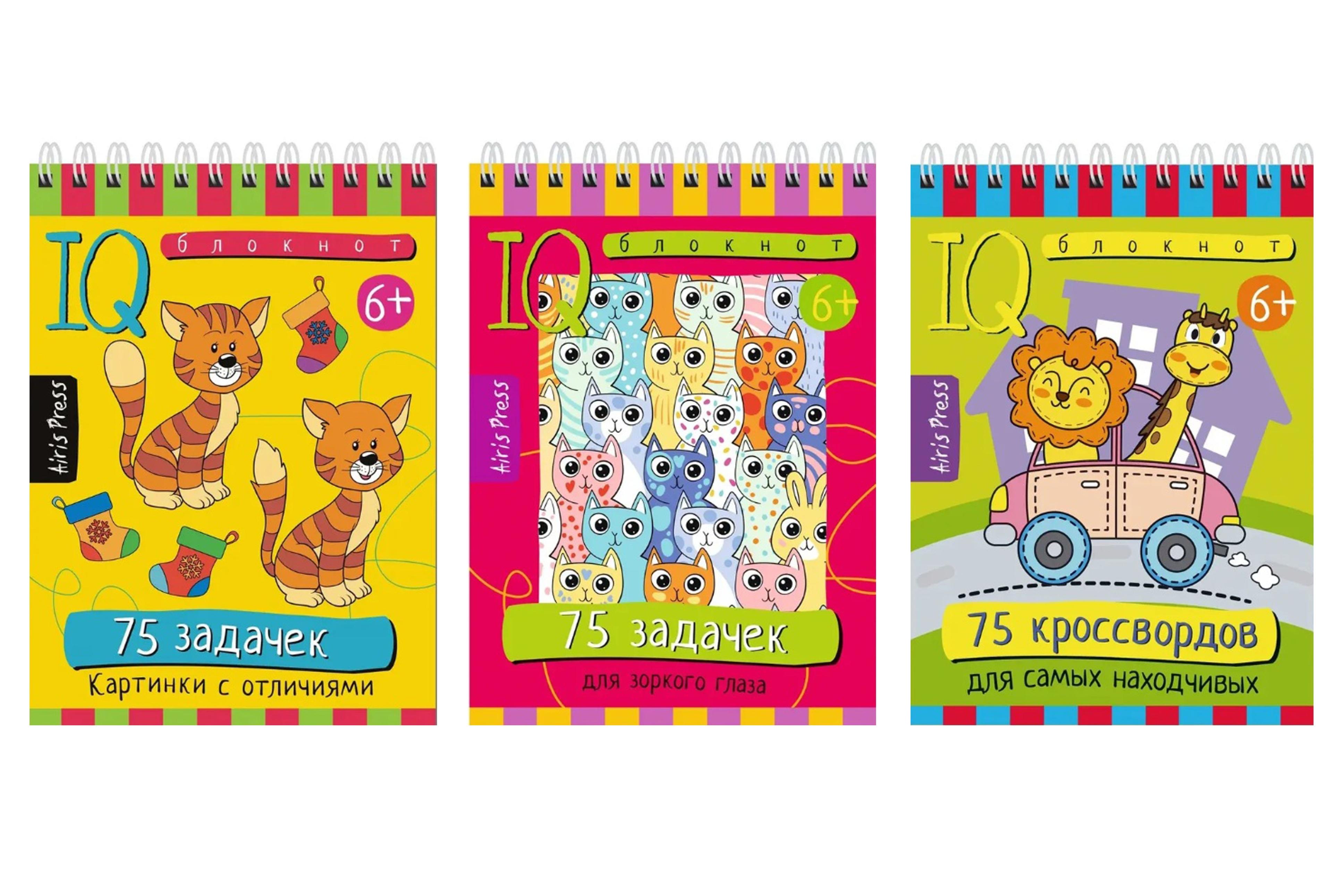 Комплект из 3 блокнотов: IQ блокноты детские. Игры для детей в дорогу 6+: 75 задачек: Картинки с отличиями + Для зоркого глаза + 75 кроссвордов для самых находчивых; Айрис-пресс