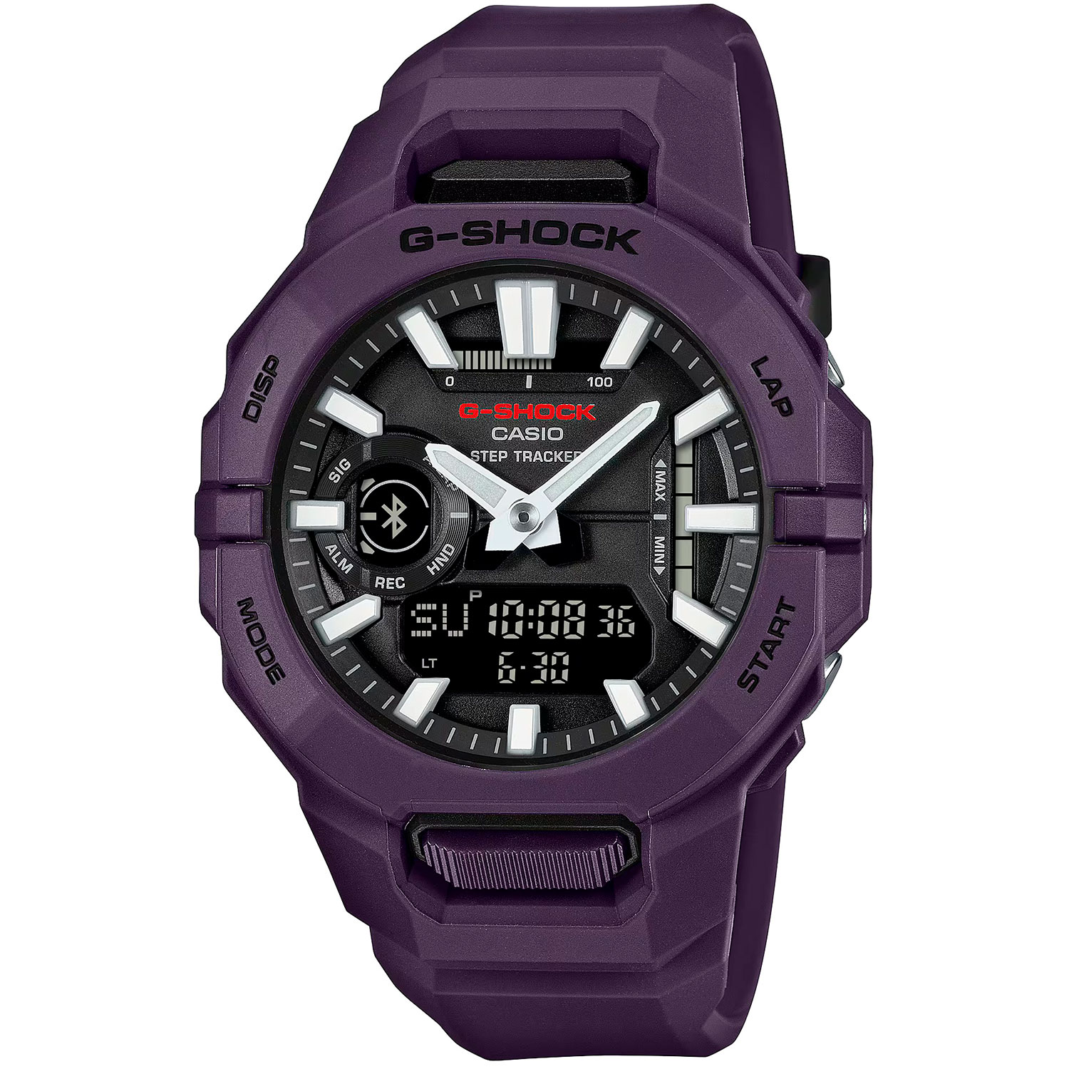 Мужские кварцевые часы. Двойная светодиодная подсветка с настраиваемой функцией послесвечения (1,5 или 3 секунды), цвет: белый. Часы оснащены технологией Bluetooth. При подключении к смартфону через функцию Bluetooth местное время на часах синхронизируется с телефоном. Расчет калорий и пройденного расстояния на основе количества шагов), включая базовый обмен веществ. Ежедневное отображение данных: количество шагов, калории, расстояние. Функция секундомера с точностью измерения 1/100 секунды и пределом измерения 24 часа. Режимы измерения: измерение времени круга/отрезка, отображение расстояния/темпа, автоматическое/ручное измерение времени круга, автоматическое уведомление о круге. Объем памяти: до 45 последних записей (месяц начала измерения, дата, час, минута, время круга/отрезка, общее время, расстояние, средний темп, количество сожженных калорий, номер круга, время, расстояние, средний темп каждого круга/отрезка). Таймер обратного отсчета от 1 секунды до 24 часов, автоповтор. Второй часовой пояс. Мировое время (300 городов). 5 ежедневных будильников. Ежечасный сигнал. Включение/выключение звука кнопок. Уведомление о низком заряде. Авиарежим. Функция перемещения стрелок. Автоматический календарь (до 2099 года). 12/24х часовой формат времени. Черный циферблат. Необритовая подсветка. Ударопрочный корпус защищает от ударов и вибрации. Корпус выполнен из фиолетового полимерного материала. Размер корпуса составляет 43,9 х 48,5 х 16 мм. Фиолетовый ремешок из полимерного материала, стандартная застежка. Прочное минеральное стекло устойчивое к мелким механическим повреждениям. Водостойкость WR 200 (погружение с аквалангом). Вес 53 г. Срок службы батареи: 2 года.