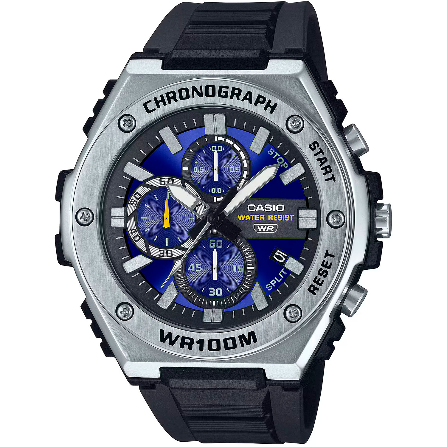 Мужской кварцевый хронограф. Секундомер с точностью показаний 1/10 секунды и пределом измерения 1 час. Апертура даты в позиции 4 часов. Синий циферблат. Корпус выполнен из нержавеющей стали и пластика. Размер корпуса составляет 52,3 х 50,9 х 14,3 мм. Черный полимерный ремешок, стандартная застежка. Акриловое стекло. Водостойкость WR 100 (плавание без погружения). Вес 50 г.