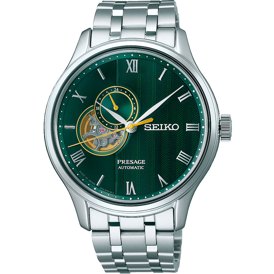 Мужские механические часы с автоподзаводом с возможностью ручного завода. Калибр механизма 4R39 на 24 камнях. Запас хода 41 час. Центральные часовая, минутная и секундная стрелки. 12/24х часовой формат времени. Зеленый циферблат с открытым балансом хода. Римская индикация времени. Круглый корпус выполнен из нержавеющей стали имеет диаметр 41,8 мм, толщину 12,5 мм. Браслет из нержавеющей стали с тройной раскладывающейся застёжкой и кнопочным фиксатором.? Устойчивое к возникновению царапин сапфировое стекло. Водостойкость WR 30 (брызги).