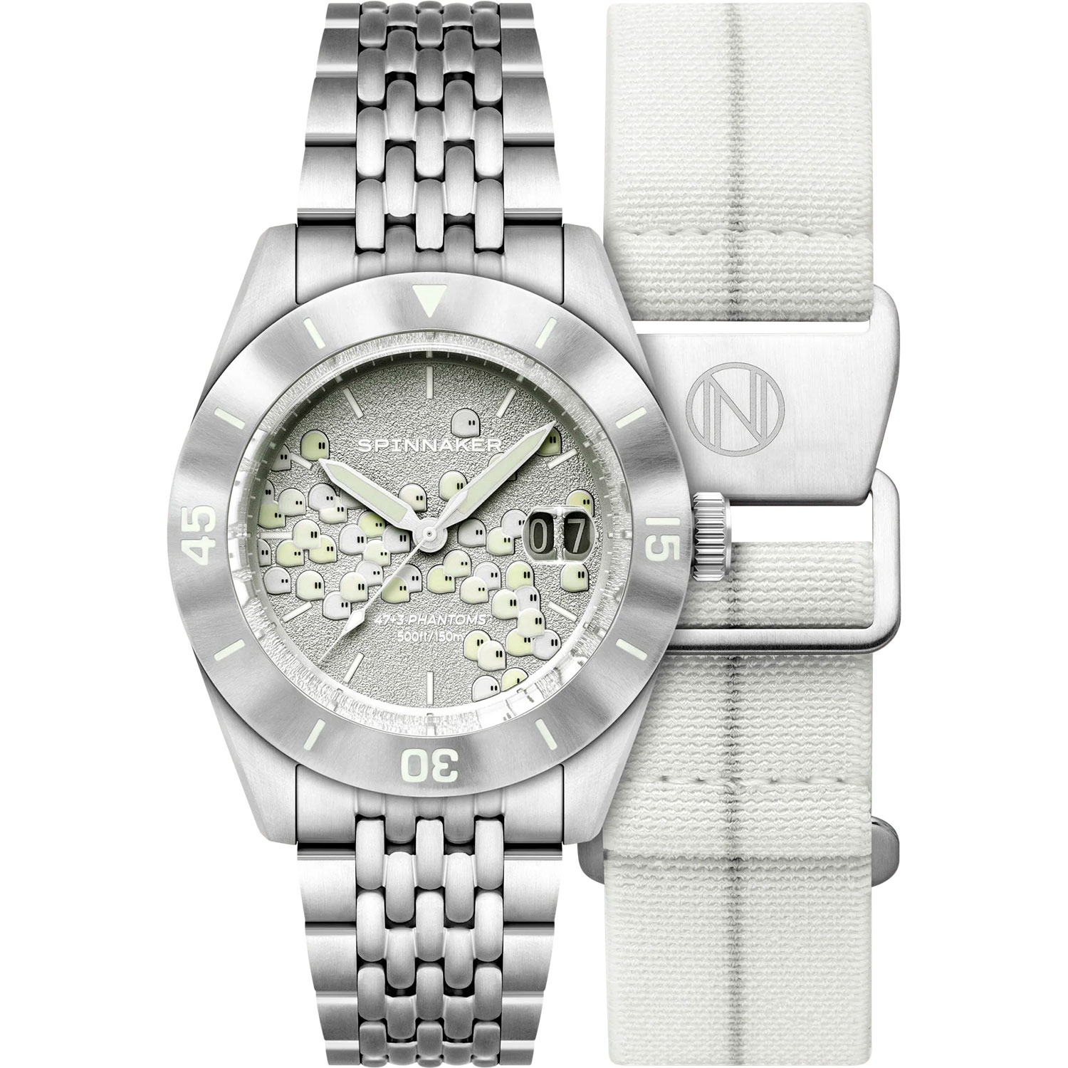 Мужские механические часы с автоподзаводом. Центральные часовая, минутная и секундная стрелки. Апертура даты в позиции 3 часов. Серебристый циферблат с изображением фантомов. Люминесцентное покрытие Swiss Newlite. Круглый корпус выполнен из нержавеющей стали. Диаметр корпуса составляет 43 мм, толщина 13,9 мм. Завинчивающаяся заводная головка. Стальной браслет шириной 22 мм, раскладывающаяся застежка. Устойчивое к возникновению царапин сапфировое стекло с антибликовым покрытием. Водостойкость WR 150 (плавание, снорклинг). В комплекте белый нейлоновый ремешок.