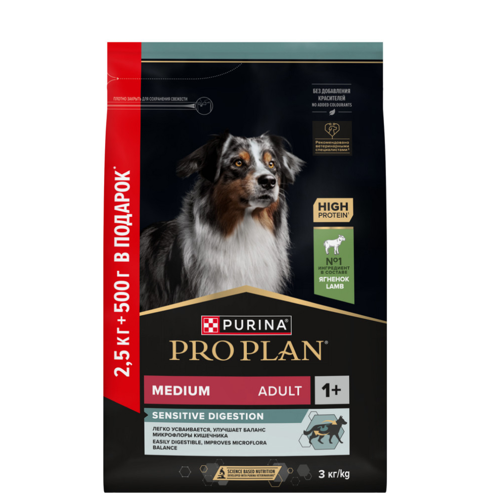 ProPlan Sensitive Digestion Сухой корм для взрослых собак средних пород с чувствительным пищеварением, с ягненком, 2,5 кг + 500 гр. в подарок PRO PLAN®
