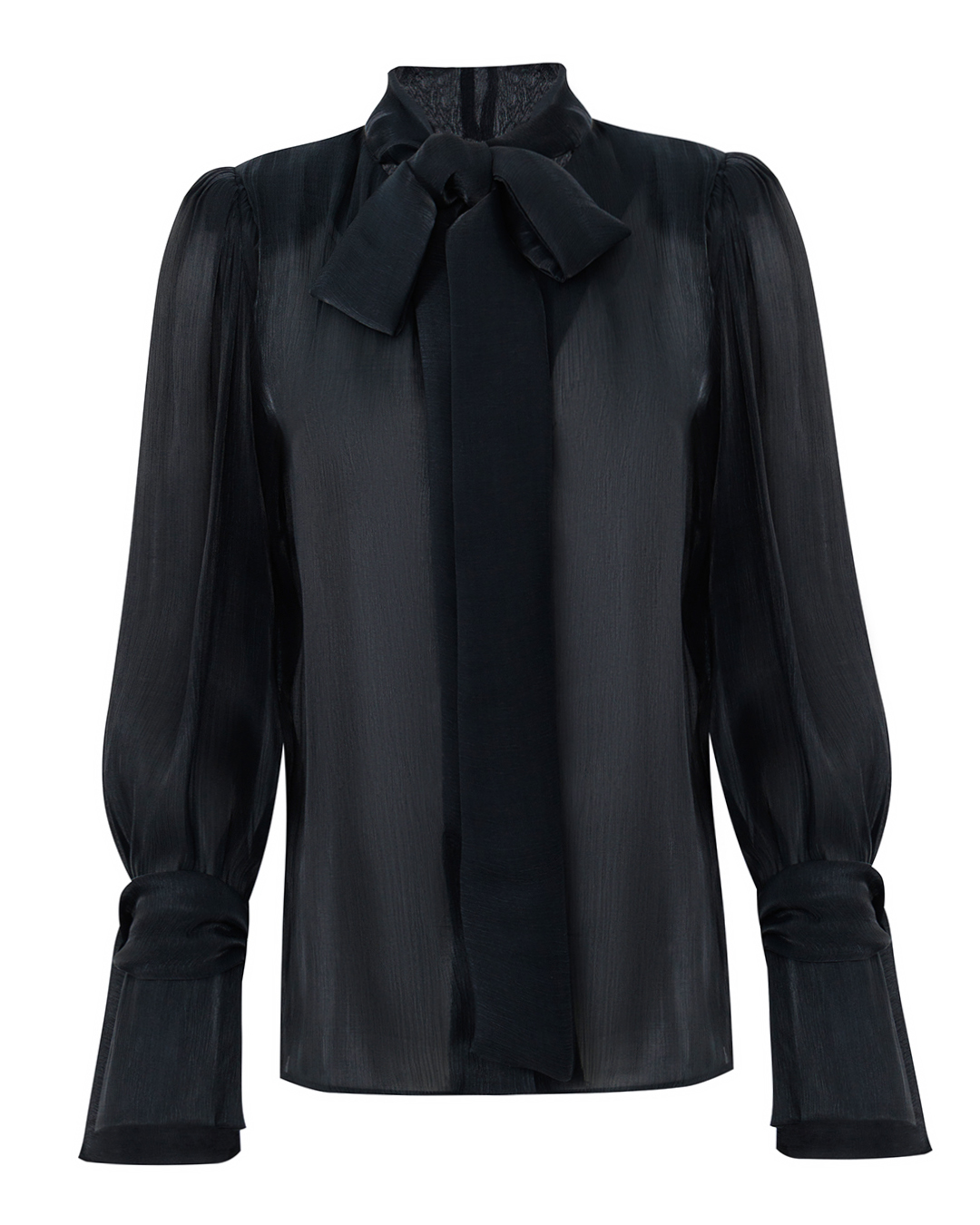 Это изысканная женская блуза представлена в элегантном черном цвете, изготовленная из легкой, полупрозрачной ткани, которая создает эффект воздушности и утонченности. Эта модель характеризуется завышенным воротом с изящным бантом, придающим образу нотку ретро-гламура и женственности. Длинные рукава блузы имеют слегка объёмный силуэт, что добавляет эффектной драмы, и заканчиваются манжетами с мягкой складкой, обеспечивающей комфортную посадку. Линия плеча немного приспущена, что гармонично сочетается с объемом рукавов, создавая свободный силуэт, идеальный для современного женственного образа. Такой дизайн позволяет сочетать блузу как с классическими брюками, так и с юбками, подчеркивая индивидуальность и вкус ее обладательницы.