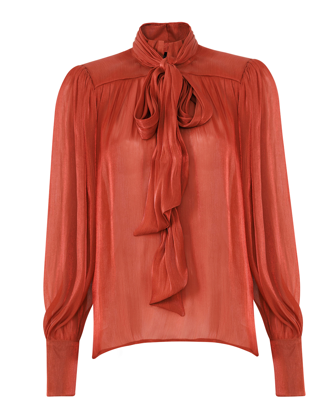 Это изысканная женская блуза представлена в элегантном красном цвете, изготовленная из легкой, полупрозрачной ткани, которая создает эффект воздушности и утонченности. Эта модель характеризуется завышенным воротом с изящным бантом, придающим образу нотку ретро-гламура и женственности. Длинные рукава блузы имеют слегка объёмный силуэт, что добавляет эффектной драмы, и заканчиваются манжетами с мягкой складкой, обеспечивающей комфортную посадку. Линия плеча немного приспущена, что гармонично сочетается с объемом рукавов, создавая свободный силуэт, идеальный для современного женственного образа. Такой дизайн позволяет сочетать блузу как с классическими брюками, так и с юбками, подчеркивая индивидуальность и вкус ее обладательницы.