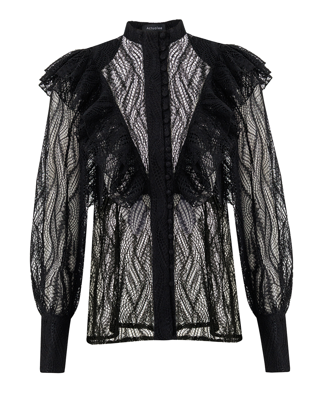 Эта блуза — настоящий шедевр в мире моды. Выполненная из деликатного кружева, она создает впечатление романтичной легкости и утонченности. Полупрозрачная структура ткани придаёт модели загадочность и элегантность, играя на грани чувственности. Элегантные воланы, акцентирующие плечи и переднюю часть, создают мягкий объем и динамику, добавляя в образ выразительность и театральность. Высокая стойка-воротник добавляет строгость и классический шик, обеспечивая идеальный баланс между роскошью и сдержанностью. Застежка с обтянутыми пуговицами гармонично вписывается в общий дизайн, придавая блузе законченный вид и подчеркивая внимание к деталям. Плотные манжеты на рукавах делают акцент на утонченности и изяществе рук, добавляя структуру и контраст. Эта блуза станет ярким акцентом гардероба, превосходно дополняя как вечерний, так и повседневный look, и подчеркивая безупречный вкус ее обладательницы.