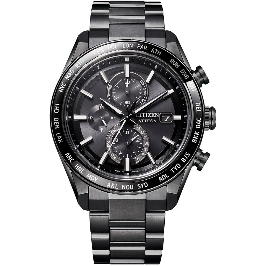 Мужской кварцевый хронограф на солнечной батарее. Часы оснащены системой Eco-Drive не требующей замены батарейки. Запас хода 6 месяцев. Функция предотвращения перезарядки. Калибр механизма Citizen H800. Автоматическая синхронизация времени по радиосигналу в четырех регионах (Германия, Япония, США, Китай), охватывающая 26 часовых зон. Центральные часовая и минутная стрелки, секундная стрелка вынесена на малый циферблат. Апертура даты в позиции 3 часов. 12/24х часовой формат времени. Индикация запаса хода (EOL). Секундомер с точностью измерения 1/20 секунды и максимальным временем измерения 60 минут. Тахиметр. Вечный календарь (до 28 февраля 2100 года). Мировое время (26 городов). Серый циферблат с люминесцентными стрелками, обеспечивающими видимость в темноте. Круглый корпус выполнен из титана с серым IP покрытием. Диаметр корпуса составляет 42 мм, толщина 10,7 мм. Титановый браслет с покрытием, раскладывающаяся застежка. Устойчивое к возникновению царапин сапфировое стекло с антибликовым покрытием. Водостойкость WR 100 (плавание без погружения, снорклинг). Вес 93,7 г.