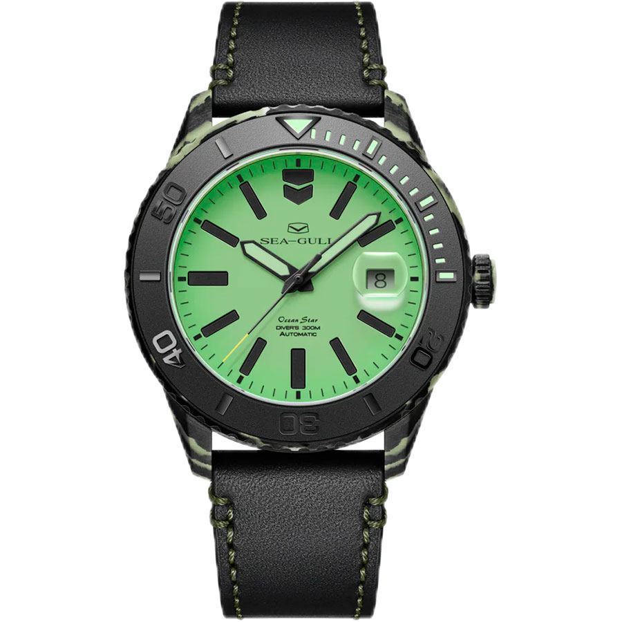 Мужские механические часы с автоподзаводом. Калибр механизма ST2130 на 28 камнях. Частота 28 800 полуколебаний в час. Запас хода 39 часов. Центральные часовая, минутная и секундная стрелки. Апертура даты с увеличительным стеклом в позиции 3 часов. Зеленый циферблат. Круглый корпус выполнен из карбона. Диаметр корпуса составляет 43,8 мм, толщина 12,5 мм. Черный кожаный ремешок, стандартная застежка. Устойчивое к возникновению царапин сапфировое стекло. Водостойкость WR 300 (погружение с аквалангом).