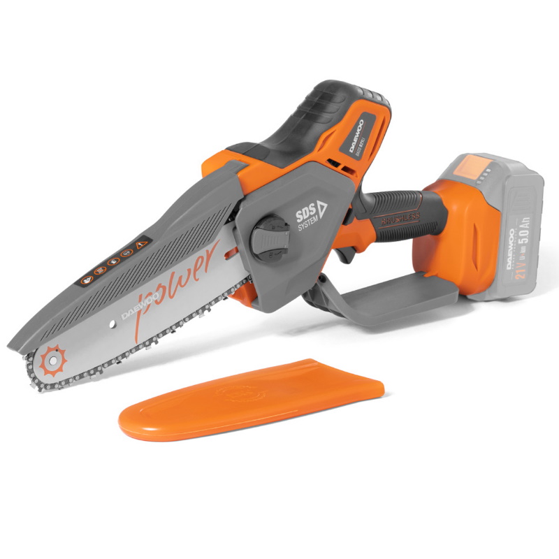 Пила Daewoo предназначена для бытового использования и проведения работы в саду при уходе за растущими деревьями и работ в кроне дерева, распила и обрезания веток деревьев, проведения работ по заготовке деревянных заготовок в соответствии с допустимой длиной резания.Преимущества 21В Li-ion единая платформа - модель совместима со всеми аккумуляторными инструментами и батареями DAEWOO линейки 21В Бесщеточный электродвигатель - за счет отсутствия коллекторно-щеточного узла он обеспечивает плавную и тихую работу, не требует сервисного обслуживания и отличается высокой производительностью и низким уровнем шума Система SDS - система SDS позволяет натянуть цепь на пиле одной рукой без использования ключа. Это упрощает процесс и делает его более безопасным, поскольку исключает случайные травмы при работе с ключом Ведущая звездочка из металла - металлическая ведущая звездочка гарантирует долговечность и надежность работы привода электропилы Система автоматической смазки цепи - обеспечивает принудительную подачу масла на цепь для снижения трения о шину, что значительно увеличивает ресурса работы электропилы Эргономичная рукоятка - рукоятка эргономичной формы обеспечивает уверенное и безопасное использование пилы. Прорезиненное покрытие препятствует выскальзыванию инструмента Надежная пильная цепь и шина - двухсторонняя шина длиной 20 см и цепь с 48 звеньями и шагом 1/4” обеспечивают быстрый и чистый рез сухого и свежего дерева