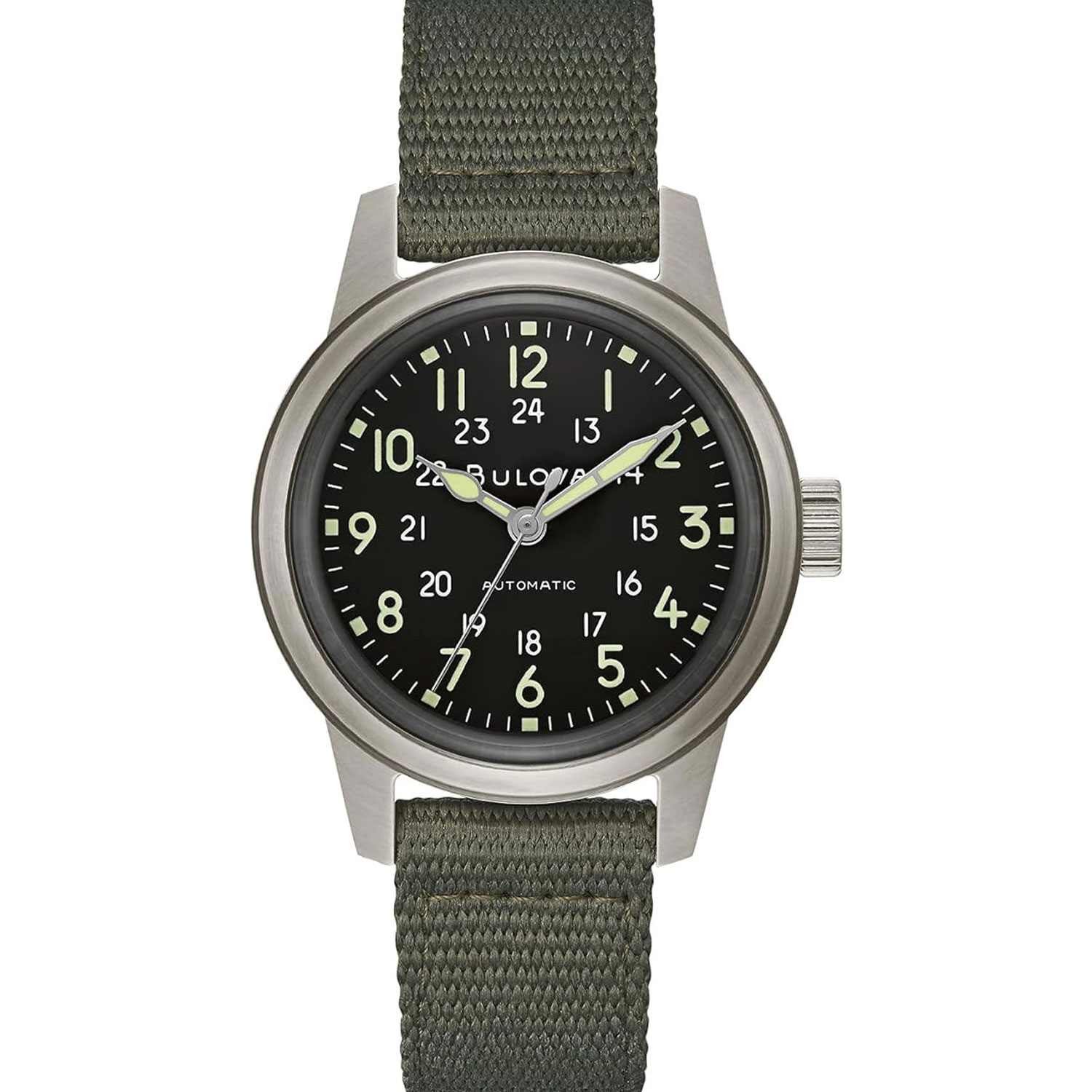 ?Мужские механические часы Bulova из коллекции Hack, вдохновлённой военными моделями середины XX века. Круглый корпус диаметром 38 мм выполнен из нержавеющей стали с матовой отделкой. Чёрный циферблат с арабскими цифрами и 24-часовой шкалой оснащён люминесцентными стрелками и метками. Минеральное стекло с двойным куполом. Зелёный нейлоновый ремешок с классической пряжкой. Водостойкость WR 30.