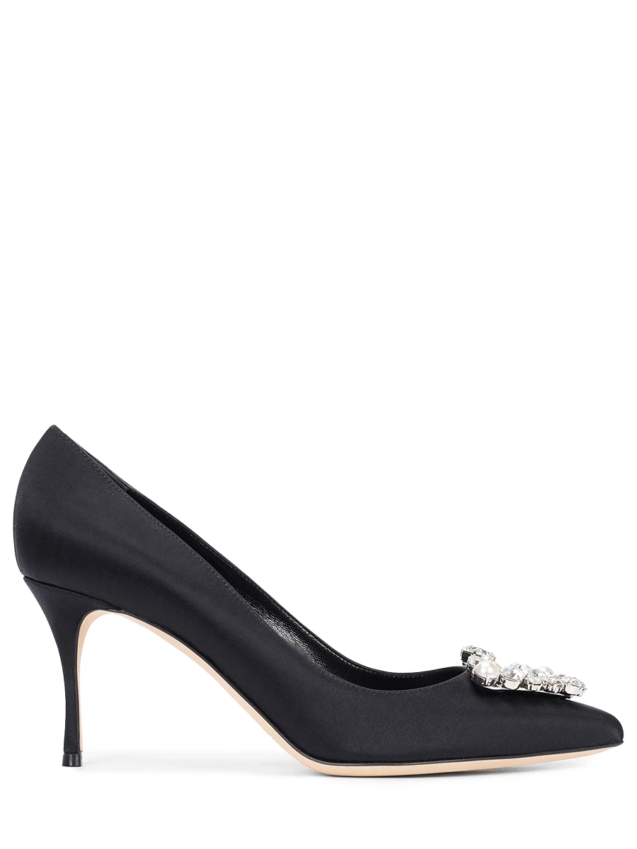 -Модель с зауженным мысом, декорированным кристаллами и жемчужными бусинами, высоким каблуком-шпилькой, внутренней отделкой из натуральной кожи.