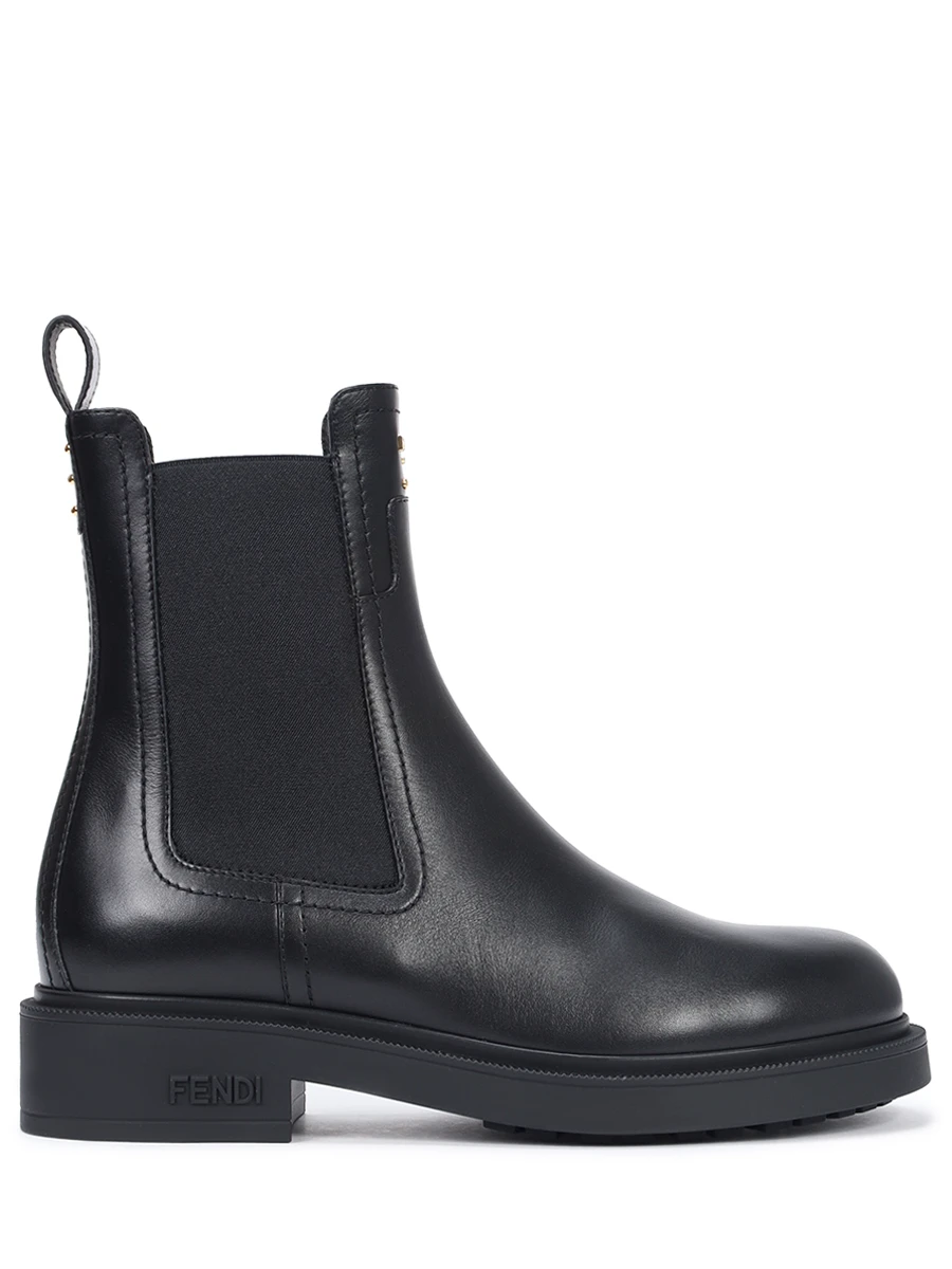 -Модель с округлым мысом, толстой резиновой подошвой и низким каблуком с надписью Fendi и золотистым логотипом спереди, облегающим голенищем с эластичными текстильными вставками по бокам, петлей на задниках, внутренней отделкой из натуральной кожи.