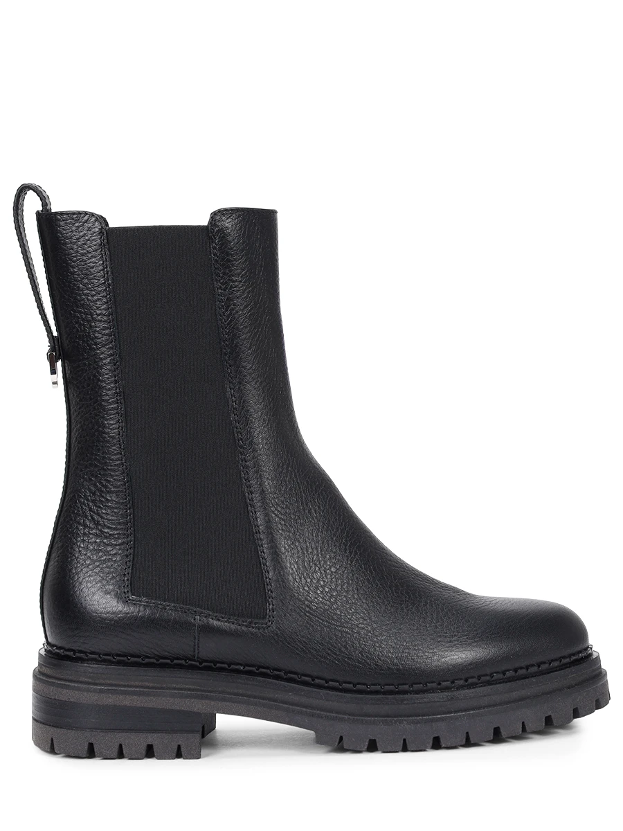 -Модель с закругленным мысом, толстой резиновой подошвой и низким каблуком с глубоким протектором, эластичными вставками из текстиля по бокам, внутренней отделкой из натуральной кожи.