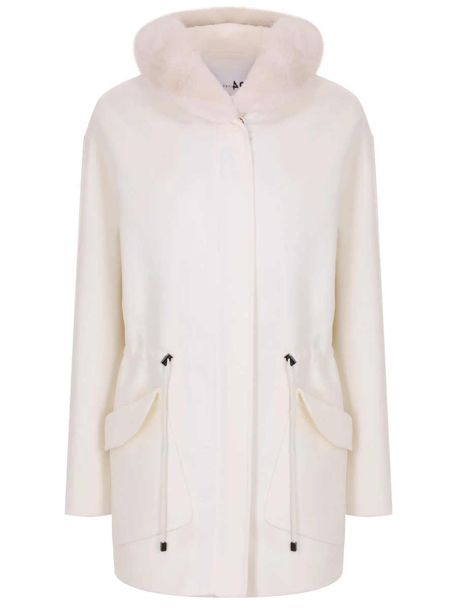-Модель свободного кроя со спущенной линией плеча, длинными рукавами, кулиской на талии, которая формирует более приталенный силуэт, объемным капюшоном с отделкой норковым мехом, крупными накладными карманами, супатной застежкой.