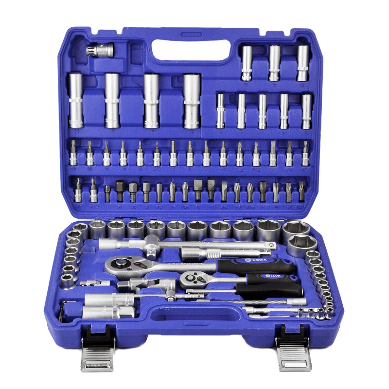 Набор инструментов БелАК ПРОФИ предназначен для крепежных работ дома, на даче, в автомастерской и гараже. Набор 94 предмета автомобильный для ремонта выполнен из специальной закаленной стали с повышенным содержанием углерода, с помощью ступенчатой закалки V3Преимущества Прочные металлические замки и эргономичный ударопрочный кейс чемодан, делают набор головок с трещоткой эффективным и мобильным Высокое качество всех элементов набора для автомобиля порадует автомобилиста любого стажа и квалификации, а универсальность комплектации позволит использовать набор как инструменты для дома, машины и других видов ремонта Набор торцевых головок, бит, ключей имеет высокие показатели твердости, что говорит о долгом сроке службы и устойчивости к сильным нагрузкам. За счет этого данный комплект можно использовать как профессиональный инструмент для автосервиса