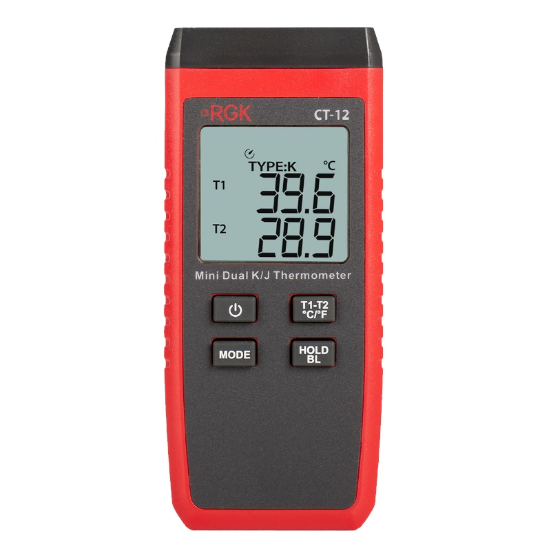 Контактный термометр RGK CT-12 - это надежный и точный прибор для измерения температуры в диапазоне от - 40 °С до + 260 °С с комплектной термопарой. Погрешность при этом составляет не более ± 1,5 °C. Главное преимущество этой модели - 2 гнезда для подключения выносных датчиков с функцией определения разности между каналами. Благодаря обширным измерительным возможностям и точности прибор может использоваться как для бытовых, так и для профессиональных измерений при работе с промышленным оборудованием, распределительными щитами, системами отопления, электродвигателями и др.Преимущества Совместимость с зондами и термопарами J/K Отображение MAX/MIN/AVG значений Фиксация результатов кнопкой HOLD Шаг шкалы 0,1 °С Выбор единиц измерения °C/°F Подсветка дисплея Автоотключение через 5 мин. бездействия