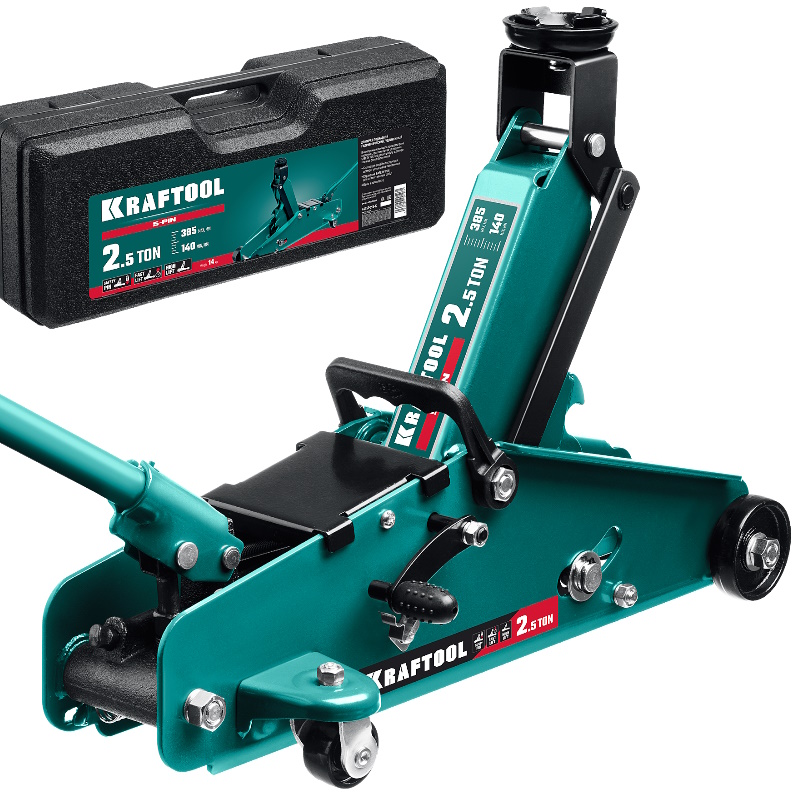 Домкрат подкатной Kraftool S-PIN с увеличенным подъемом и фиксатором в кейсе 2.5т 43457-2.5-K