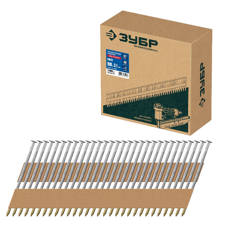 Реечные гвозди Зубр SN21 предназначены для сборки деревянных конструкций, крепления тонколистового металла до 0.9 мм. В каркасном домостроении используются для сборки каркаса дома и установки черновых полов. Монтаж производится при помощи гвоздезабивного пистолета (нейлера), рассчитанного на работу с гвоздями в кассетах с углом наклона 21 град. Во избежание повреждения кассеты на бумажной основе при установке в магазин нейлера не допускайте сильных ударов толкателя по кассете с гвоздямиПреимущества Кольцевая накатка и рифленая поверхность гвоздей обеспечивают повышенную прочность конструкции Быстрый монтаж: гвоздь забивается при помощи гвоздезабивного пистолета (нейлера)