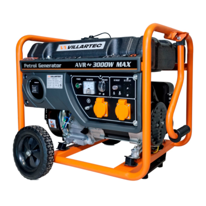 Генератор бензиновый Villartec - компактный бензиновый агрегат максимальной мощностью 3 кВт, предназначенный для электропитания бытовых электроприборов и инструментов. Его небольшой вес всего 40 кг обеспечивает высокую мобильность и простоту переноски. Этот надежный и удобный прибор снабжен тремя розетками (двумя на 220 В 16 А и одной на 12 В), а также дисплеем "3 в 1", отображающим напряжение, частоту тока и отработанные моточасы. Легкий пластиковый бензобак, исключающий появление ржавчины, существенно продлевает срок службы прибораПреимущества Генератор VILLARTEC отличается высокой надежностью, так как при его разработке уделено большое внимание всем конструктивным элементам Высокоресурсный двигатель, надежный гильзованный OHV, обеспечивает стабильную работу в различных условиях Все контакты соединений имеют большое сечение, розетки работают без перегрева, даже при максимальной нагрузке Автоматический регулятор напряжения AVR безупречно поддерживает выходное напряжение на соответствующих значениях в зависимости от мощности энергопотребителя Генератор оснащен предохранителем, защищающим от критической перегрузки, а надежный ручной стартер обладает большой стойкостью к нагрузкам