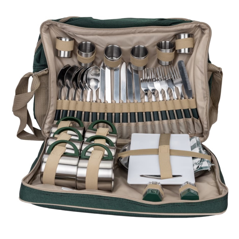 Набор для пикника Green Glade T3338 является незаменимой вещью для отдыха на природе и в дальних поездках.Преимущества Рассчитан на 6 персон Столовые приборы и кружки изготовлены из полированной нержавеющей стали с пластиковыми ручками Салфетки выполнены из хлопка с принтом в клетку Солонка и перечница - из прозрачного пластика Все приборы компактно помещаются в специальную сумку из полиэстера, которая закрывается на застежку-молнию Сумка может хранить свежесть продуктов до 12 часов при использовании с хладогентом Плечевой ремень способствует удобной переноске набора для пикника