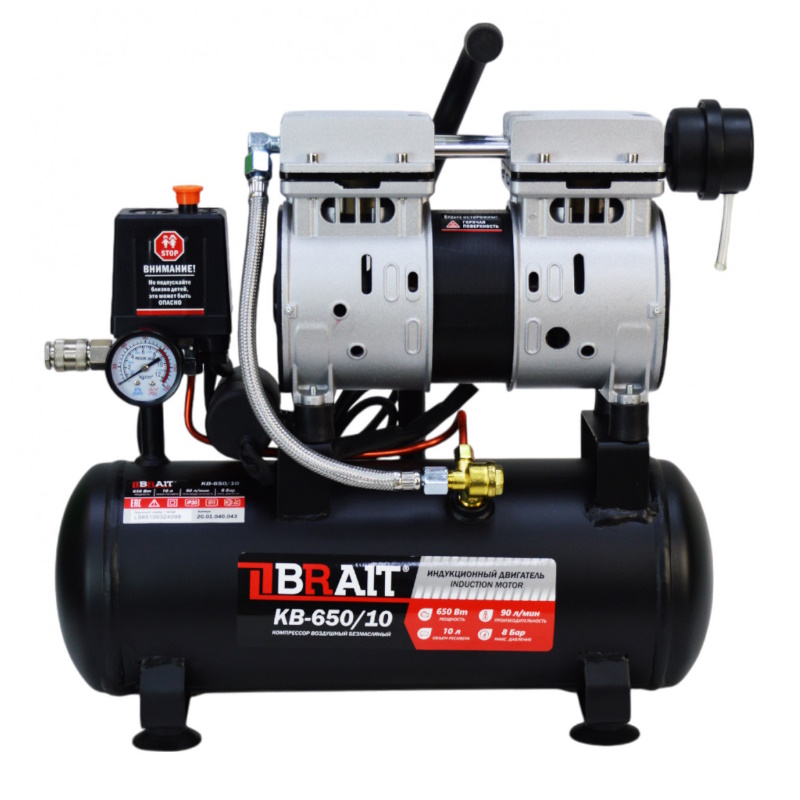 Компрессор воздушный Brait 20.01.040.043 представляет собой современное оборудование для питания пневмоинструмента. Удобен для производства, мастерских и гаражей. Изделие не требует сложных подготовительных работПреимущества Готов к работе сразу после покупки Вырабатываемый воздух не содержит примесей масла, что не требует установки дорогостоящих маслоотделителей Не требует заправки маслом и контроля за наличием и его замены Прямой привод упрощает конструкцию и увеличивает надежность Выключатель давления обеспечивает автоматическое включение/выключение изделия при расходе сжатого воздуха Быстросъемный штуцер обеспечивает удобное и быстрое подключение и отключение пневмоинструмента Контроль давления в ресивере и на выходе при помощи манометра Удобная ручка для транспортировки
