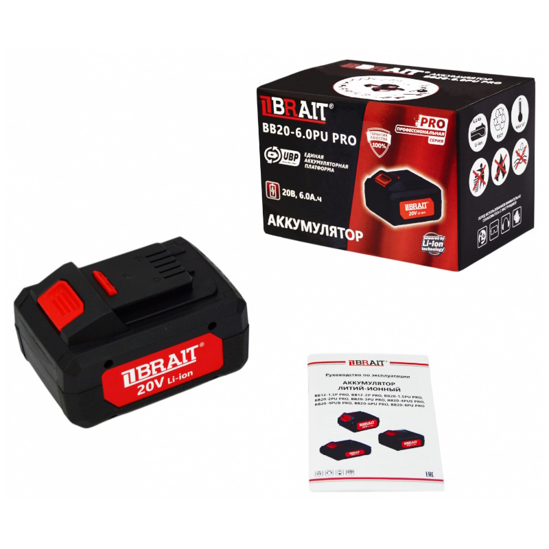 Аккумулятор предназначен для использования с аккумуляторными инструментами BRAIT платформами PU и PUBLПреимущества Не имеет эффекта памяти и не подвержен саморазряду Благодаря специальной системе крепления осуществляется быстрая фиксация батареи на совместимое устройство За счет этого аккумулятор способствует длительному автономному функционированию различных электроинструментов Основным материалом для производства корпуса является ударопрочный пластик высокого качества Поэтому батарея характеризуется устойчивостью к изнашиванию и значительным механическим нагрузкам Устройство сохраняет потребительские свойства на протяжении всего срока службы Модель не перегревается при длительной работе, что исключает риск поломки