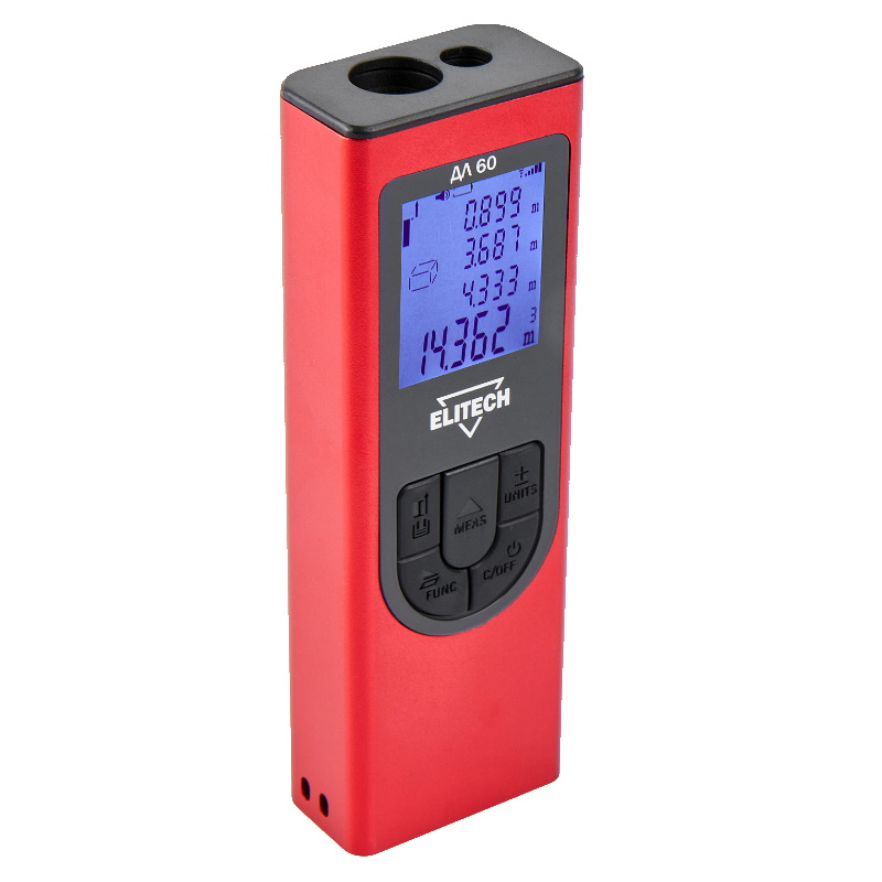 Лазерный дальномер ELITECH ДМ предназначен для быстрого измерения расстояний на дальности до 60 метров. Он точнее обычной рулетки при измерении расстояния более 8 метров.Преимущества Дальномер имеет возможность производить косвенные вычисления (измерять высоту объекта) по теореме Пифагора, а также замеры площади и объема В качестве начала измерения используется 2 точки отсчета – от передней кромки и от заднего края Дисплей прибора имеет подсветку, что повышает удобство работы с прибором в условиях недостаточной освещенности Прибор позволяет сохранить в памяти 20 значения измерений