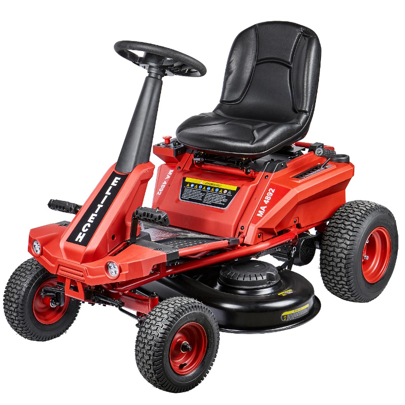 Газонокосилка аккумуляторная Elitech (E1610.005.00) 210454, сиденье, 48В, 75Ач предназначена для кошения травы на систематически обрабатываемой и предварительно подготовленной поверхности (газон, лужайка, поле для игр и т.п.) с уклоном не более 15 градусов, на участках до 4000 м2, в стандартной комплектации с выбросом скошенной травы вбок, либо кошением травы в режиме мульчирования, когда скошенная трава является удобрением для вновь растущей.Преимущества Компактная конструкция Управление по принципу автомобиля с автоматической трансмиссией Высокое качество кошения (дека с двумя ножами) Индикатор статуса зарядки аккумулятора, круиз-контроль, электрический механизм включения вращения ножей, два USB порта Зарядное устройство со стабилизатором напряжения в комплекте Кошение с выбросом травы вбок + мульчирование (стандартная комплектация) Кошение со сбором травы в травосборник (аксессуар) Фары LED