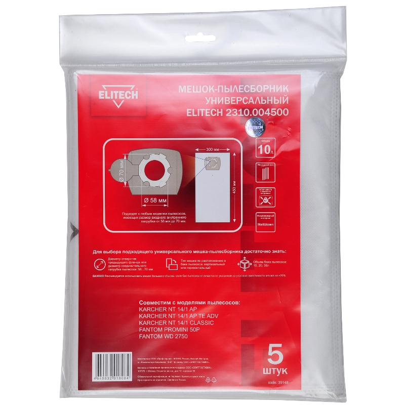 Пылесборник Elitech 2310.004500 , синт, 3-х слойный универсальный,5шт.,д/влажного мусора 205245