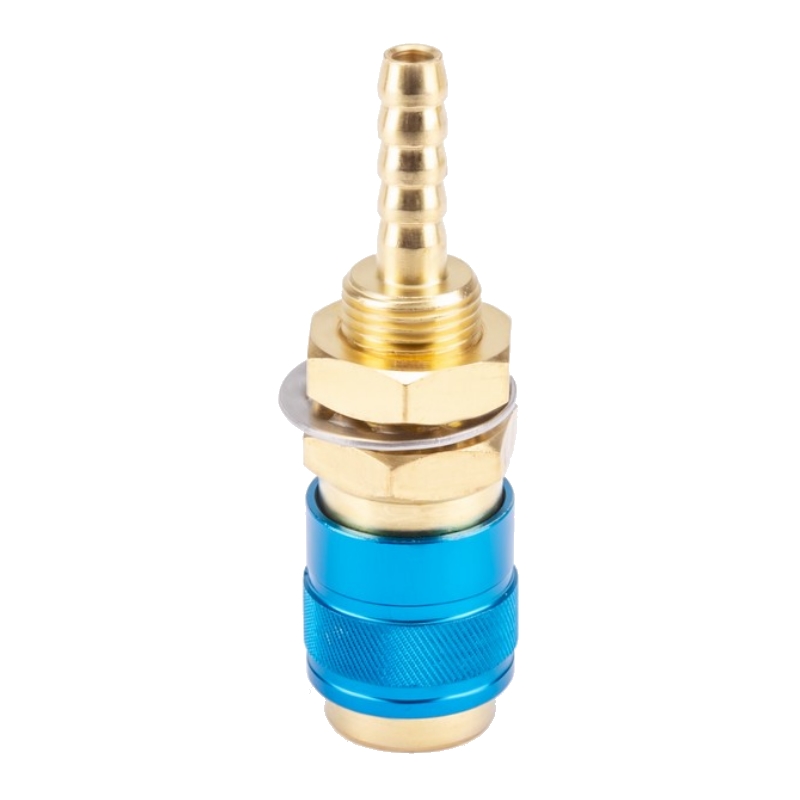 Быстросъемный разъем FoxWeld 7041 (синий) представляет собой соединитель "мама-папа" для подключений в системах жидкостного охлаждения сварочных горелок (полуавтоматических и аргонодуговых)Преимущества Материал: сплав меди с цинком, обеспечивает прочность и долговечность Конструкция: "мама" — быстросъёмный разъём диаметром 9 мм, "папа" — ниппель-ёлочка диаметром 6 мм, что обеспечивает надёжное и герметичное соединение Предназначен для присоединения шлангов системы жидкостного охлаждения, упрощая монтаж и демонтаж без применения инструментов Компактные размеры и небольшой вес обеспечивают удобство использования и снижают нагрузку на шланги. Быстрая и надёжная замена деталей в системе охлаждения позволяет минимизировать простой оборудования Совместимость с системами охлаждения FoxWeld TIG и полуавтоматических горелок, что делает его универсальным для профессионального применения