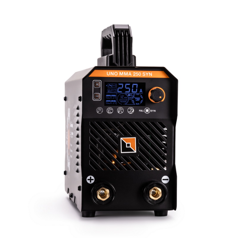 Сварочный аппарат FoxWeld UNO MMA 250 SYN предназначен для ручной дуговой сварки (MMA) любыми типами электродов, а также для сварки вольфрамовыми электродами в среде инертного газа аргон (TIG LIFT). В модели есть полноценная синергетика, которая рекомендует соотношение параметра силы тока сварки к толщине свариваемого сплава металла.Преимущества Процесс поджига дуги сварки в среде Аргона вольфрамовым электродом происходит за счёт касания При условии работы от сети с некачественным электроснабжением, аппарат может хорошо работать с сетевым напряжением от 140 до 270 вольт, процесс сварки при этом стабилен В источнике питания включается и отключается функция VRD. При включении данной опции снижается напряжение холостого хода до параметров, которые не угрожают жизни человека Байонеты мощные, надёжные, размером 35-50, позволяют с минимальными потерями снять всю мощность сварочного тока Регулируемые функции Hot Start (Горячий старт) и Arc Force (Форсаж дуги) Функция Antisticking (Антизалипание) с возможностью отключения Присутствует защитная опция, которая отключает сварочный аппарат при перегреве, работает данная система от термодатчика, установленного на радиаторе выходных диодов. Выдув воздушного потока осуществляется через переднюю панель аппарата Сварочный аппарат снабжён массивной и надёжной складывающейся ручкой для транспортировки