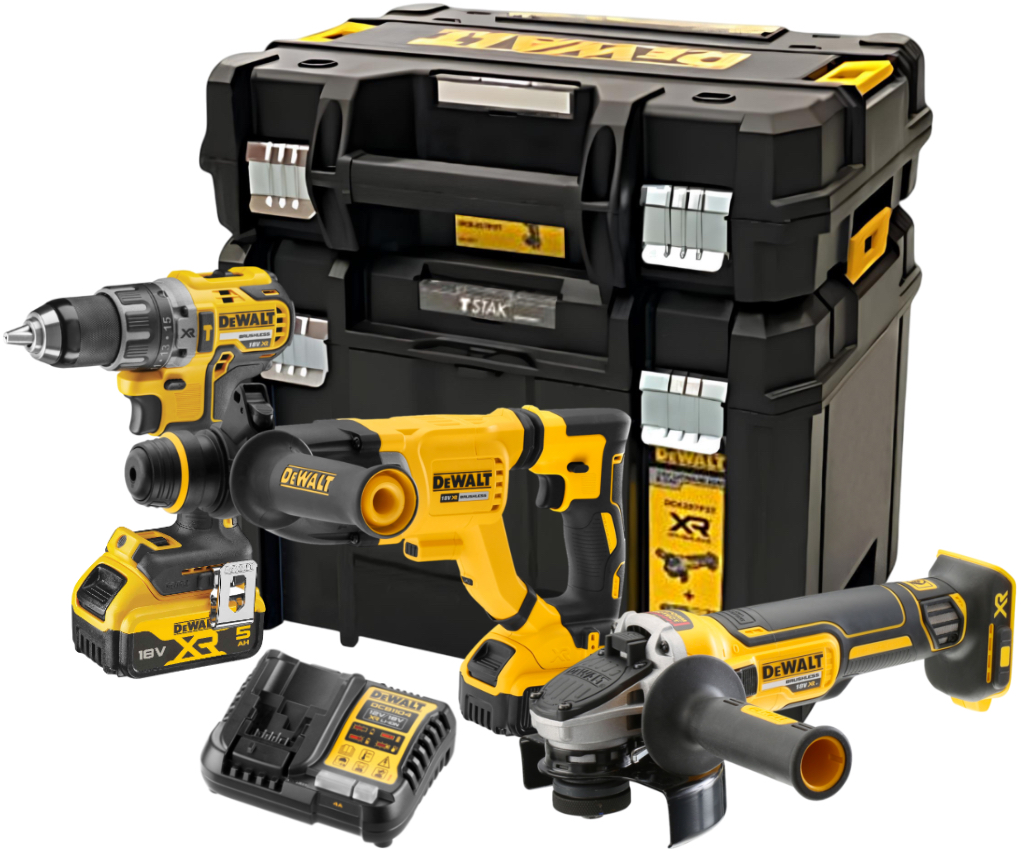 Аккумуляторный набор DEWALT DCK327P2T, 18 В: дрель DCD791 + перфоратор DCH263 + УШМ DCG405, с 2 АКБ 5 Ач и ЗУ, в 2 кейсах TSTAK DCK327P2T-QW